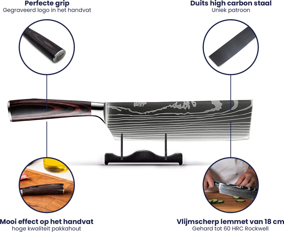 Ben je een thuischef of professionele kok die de meeste tijd met groenten in de weer is, dan is dit mes ontworpen voor jouw dagelijkse werk. Volgens de aanbieder haalt het lemmet een hardheid van circa 60 op de Rockwell-schaal (HRC), wat staat voor een slijtvaste snede en langdurige scherpte. De punt is iets afgerond zodat je ook in een schommelende snijbeweging soepel door kunt werken. Het pakkahouten handvat en de krop die niet volledig doorloopt, geven je controle en comfort, plus een stukje extra veiligheid.