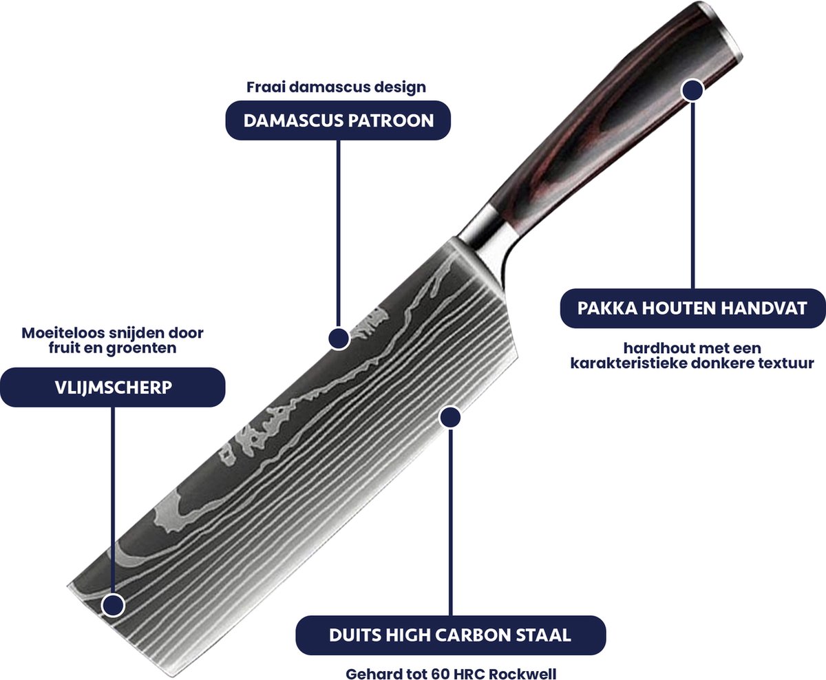 | Esthetische afwerking met damascus print die krassen minder laat opvallen | Beschrijving refereert aan messenset, maar dit product betreft één nakiri mes |