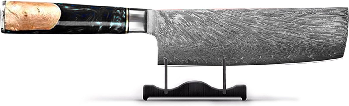 De eerste indruk is dat dit mes is ontworpen om op te vallen zonder in te leveren op functionaliteit. Het lemmet bestaat uit meerdere lagen staal die samen een golvend damastpatroon vormen. Dat patroon is niet alleen esthetisch; het helpt voedsel iets losser van het lemmet te laten glijden dan bij volledig vlak gepolijste bladen.