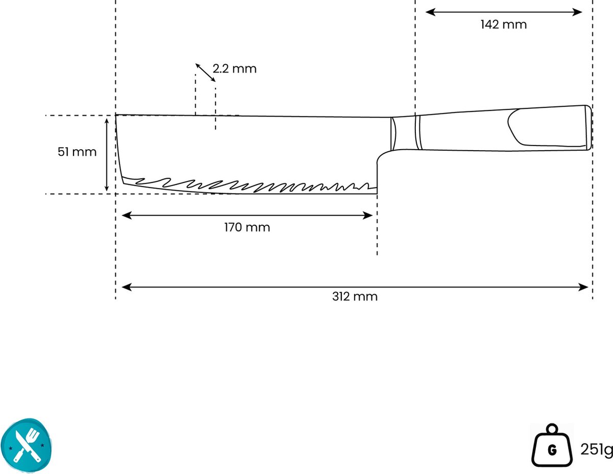 Een nakiri kenmerkt zich door z’n rechte snijvlak; hier is de punt licht afgerond. Daardoor kun je niet alleen zuiver hakken en duwen, maar ook vanuit een hoek vloeiend doorsnijden. Denk aan het versnipperen van kool of het schuin afsnijden van prei. De lengte van 18 centimeter is een fijne middenweg: lang genoeg voor grote slagen door een stapel groenten, compact genoeg voor precisie bij knoflook of kruiden.