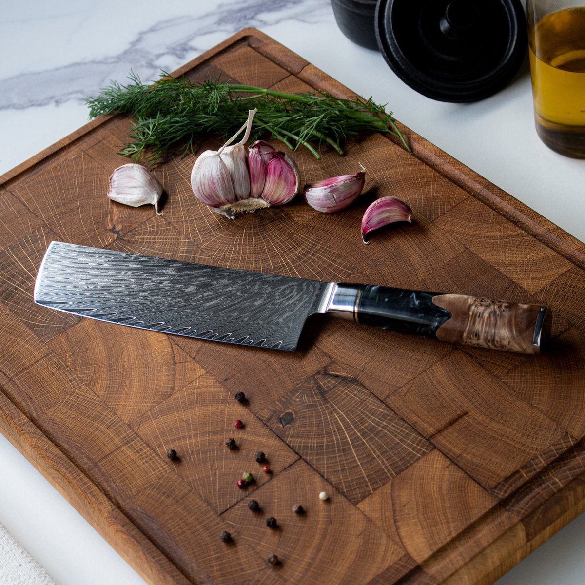 De combinatie van eikenhout en epoxy levert een greep met een fijne textuur: voldoende grip zonder plakkerig of te ruw te zijn. De rondingen sluiten comfortabel aan bij verschillende handmaten. In de keuken merk je dat bij repetitief werk—bijvoorbeeld kilo’s aardappelen of knollen—waar je ritme en consistentie belangrijk zijn. De grip geeft je vertrouwen om dunner te snijden en gelijkmatiger te hakken.