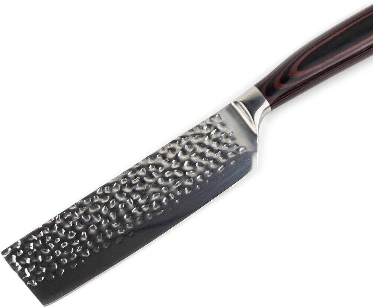 Het Shinrai Japan Nakiri mes uit de gehamerde RVS-serie is een recht, breed groentemes met een 18 centimeter lang lemmet dat speciaal is ontwikkeld om groenten razendsnel, heel precies en dun te snijden. Het gehamerde, hoogwaardig roestvast staal met een door de fabrikant opgegeven hardheid van 59 op de schaal van Rockwell zorgt voor langdurige scherpte, terwijl de pakkahouten handgreep voor grip en balans zorgt. De subtiel afgeronde punt helpt om vanuit een hoek in te zetten en soepeler door te snijden.