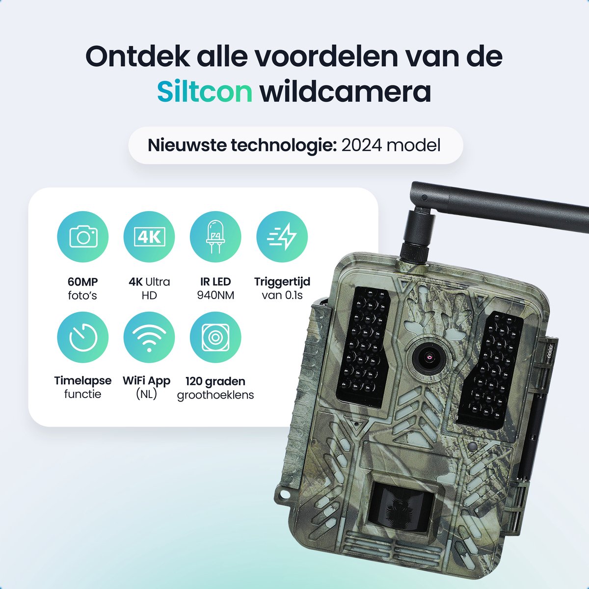 De Siltcon Wildcamera is een draagbare buitencamera bedoeld om dieren, afgelegen locaties en buitenactiviteiten continu vast te leggen, zowel overdag als ’s nachts. De camera combineert hoge resolutie foto- en videomogelijkheden (4K / 60MP) met nachtzicht, een eigen wifi-netwerk voor directe smartphoneverbinding en een waterdichte behuizing (IP67).