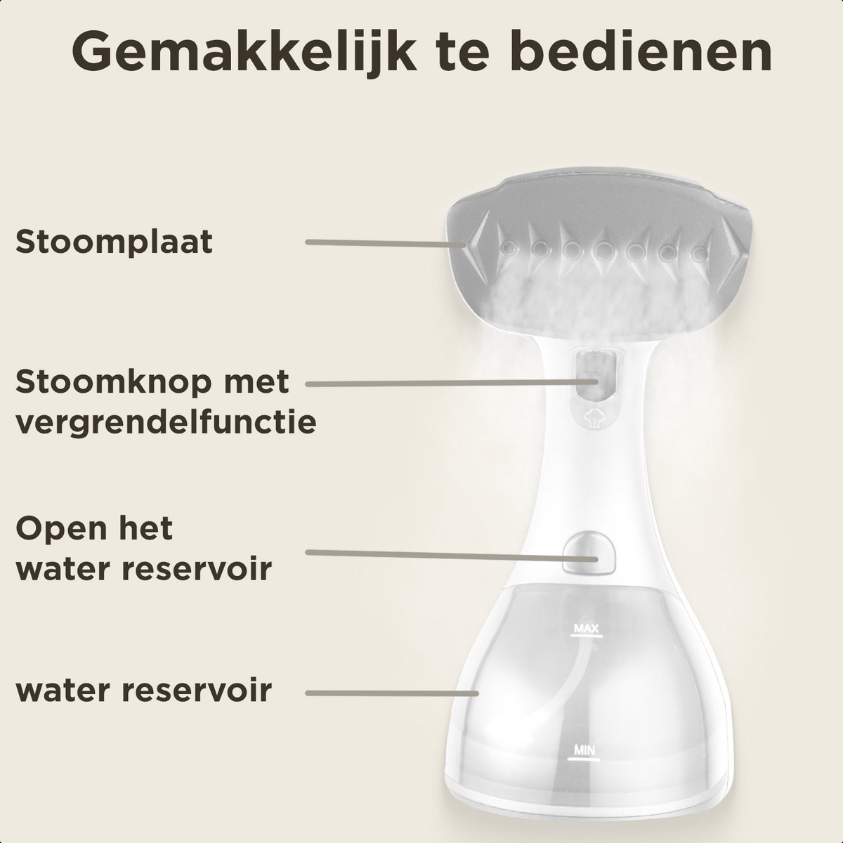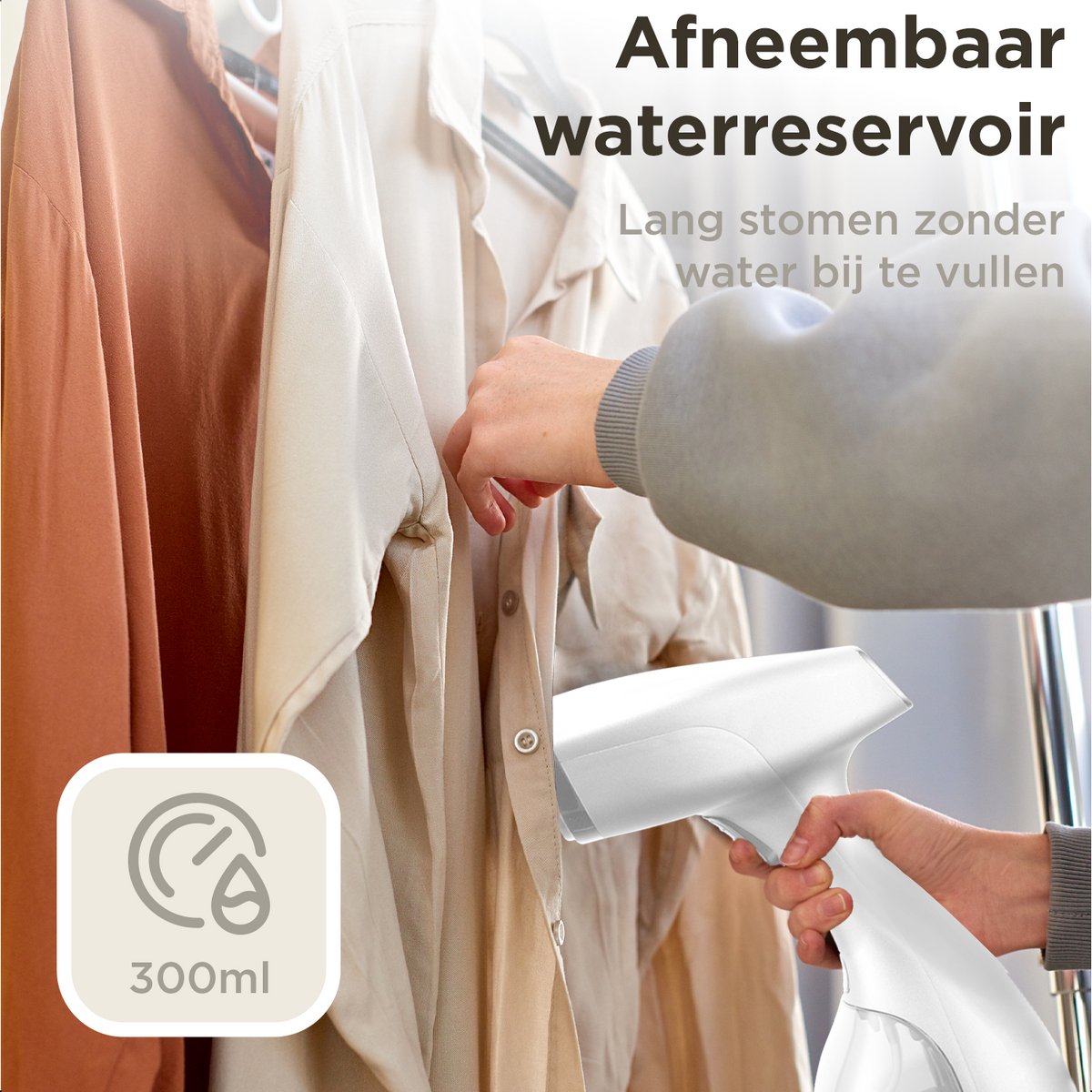 - Comfort en snelheid: binnen een halve minuut paraat, zonder strijkplank, met genoeg stoomcapaciteit voor meerdere kledingstukken.