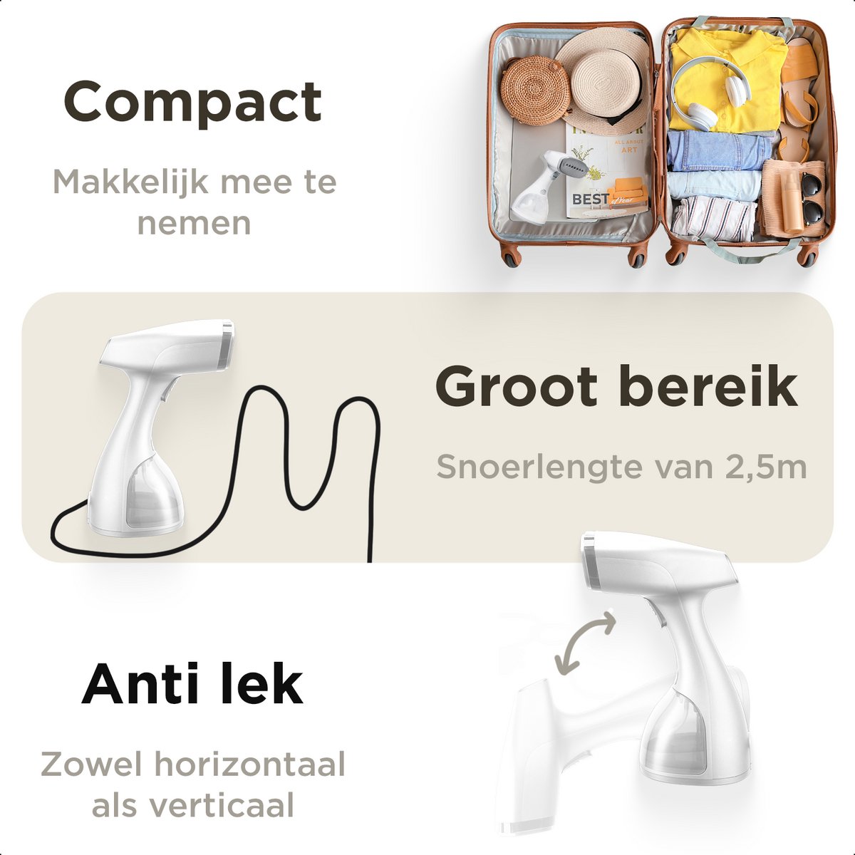 Uitstekende klantenservice van de leverancier. Handig en snel; een strijkijzer is niet meer nodig. Perfect voor op reis, en als extra pluspunt doodt de hete stoom 99,9% van de bacteriën. Absoluut een aanrader.