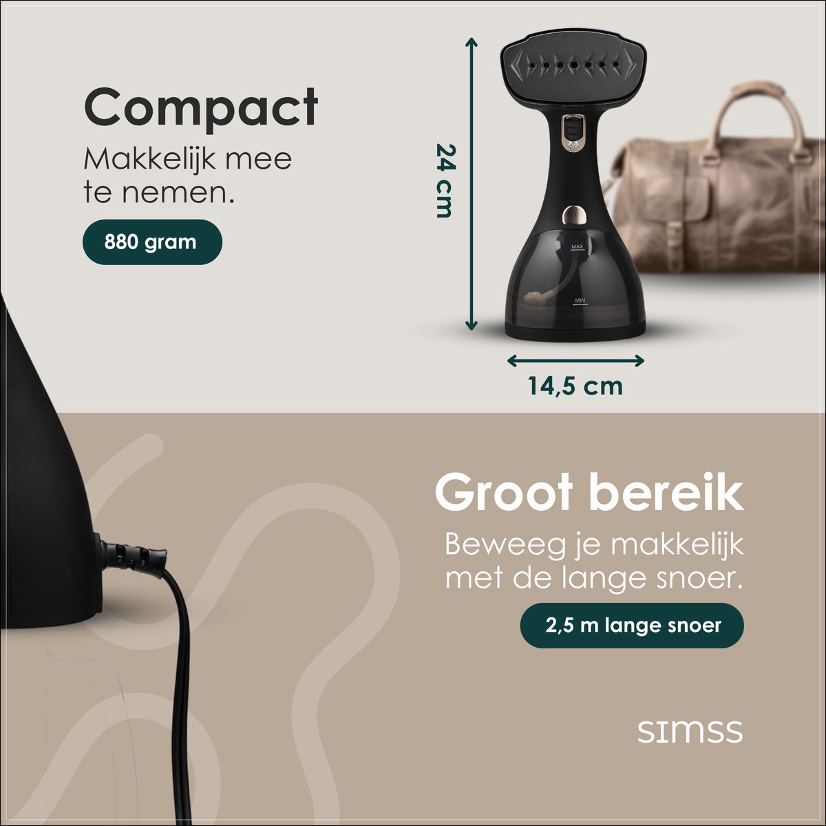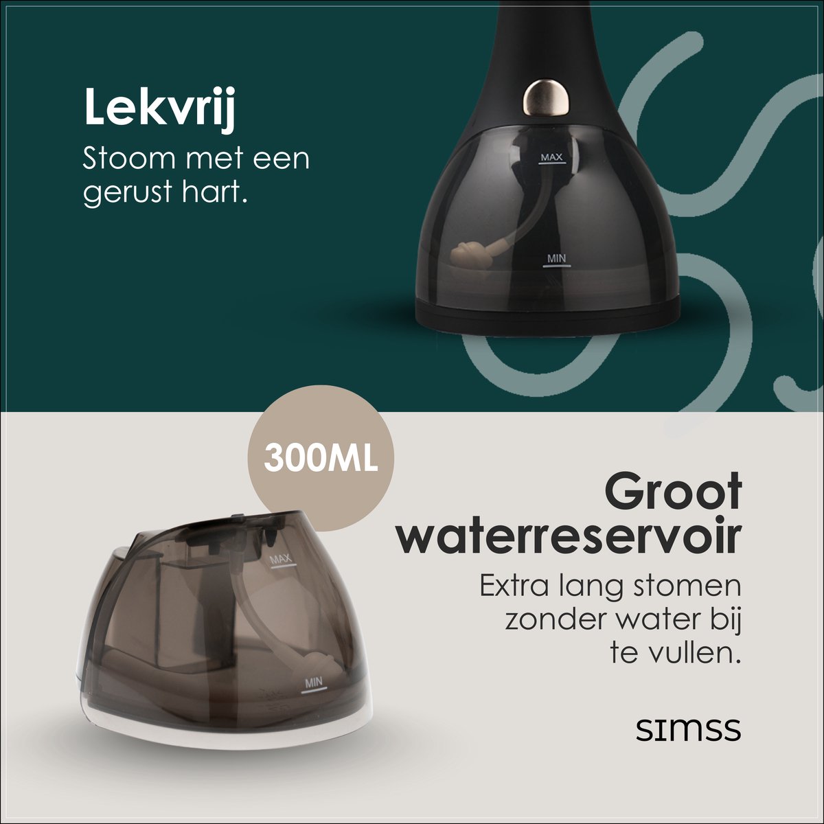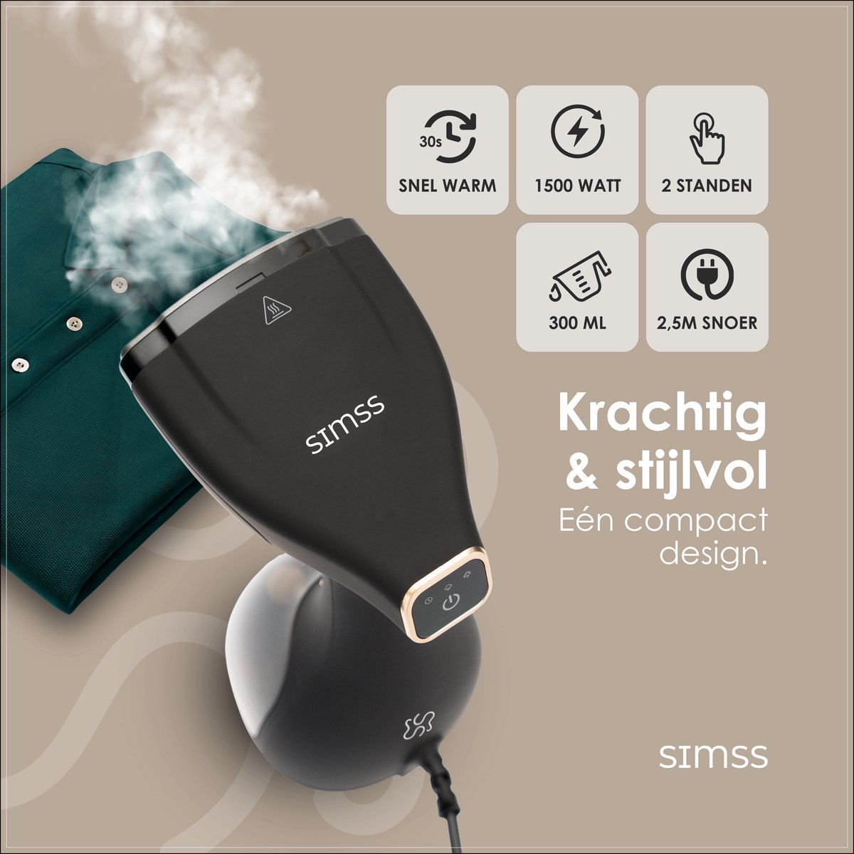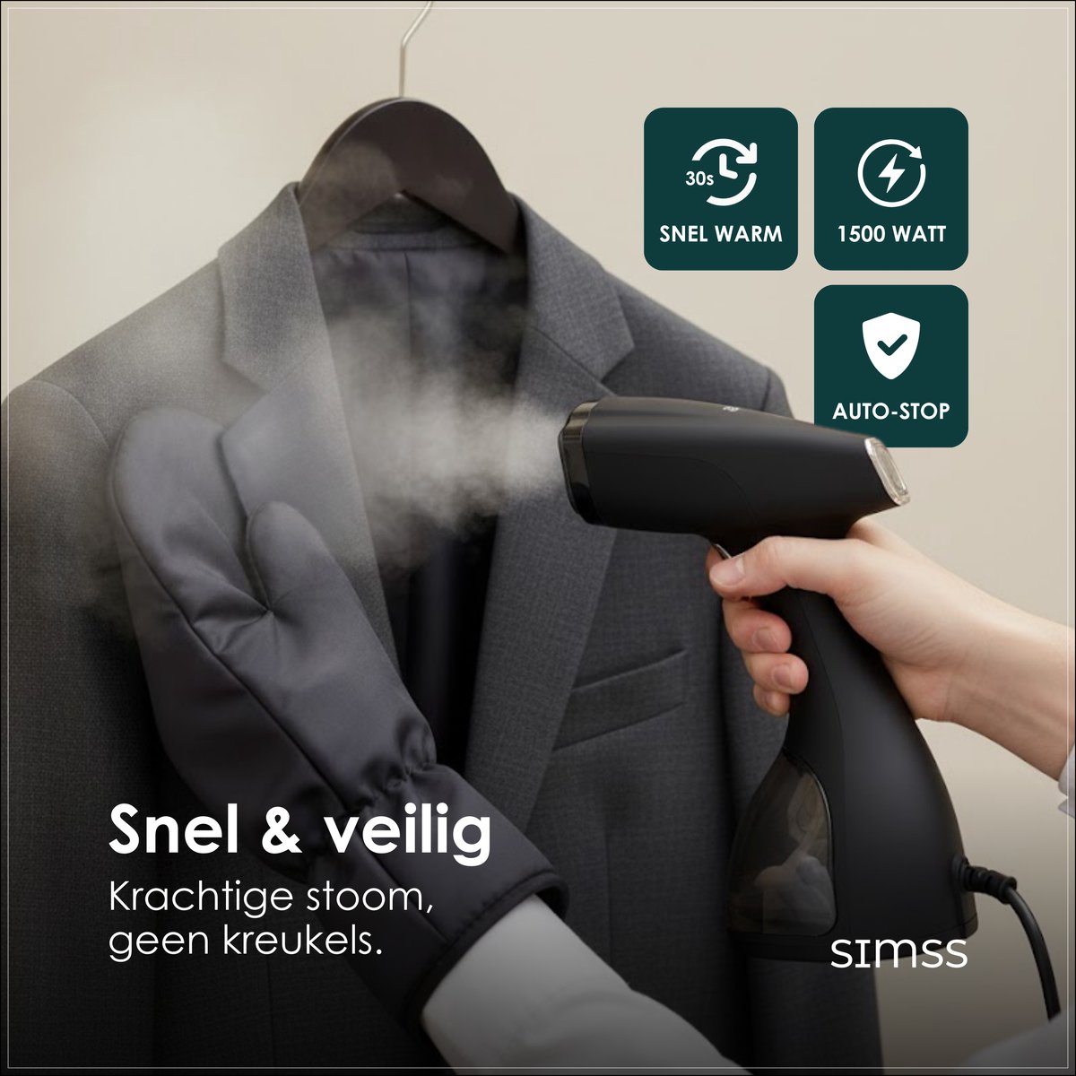 Specificaties: Simss® – Kledingstomer test: snelle opwarmtijd, stoomreiniger