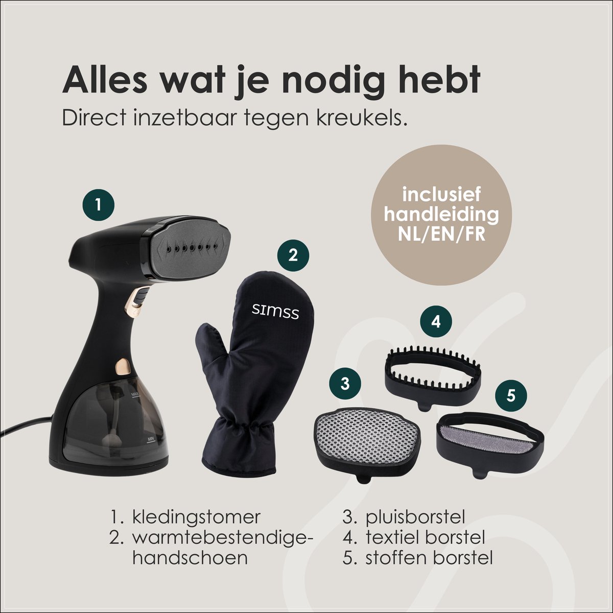 - Textielborstel: pakt dikkere weefsels aan, helpt om stoom dieper door te laten dringen.