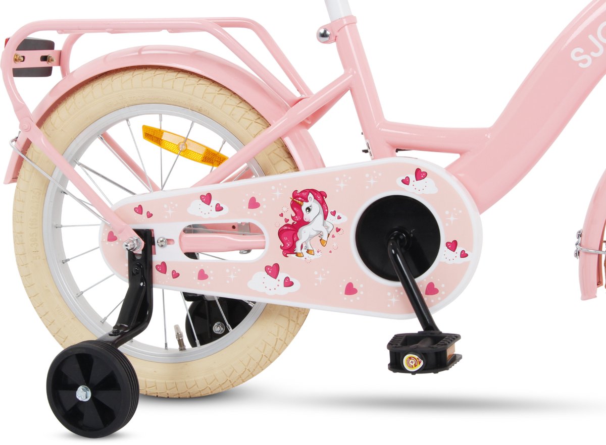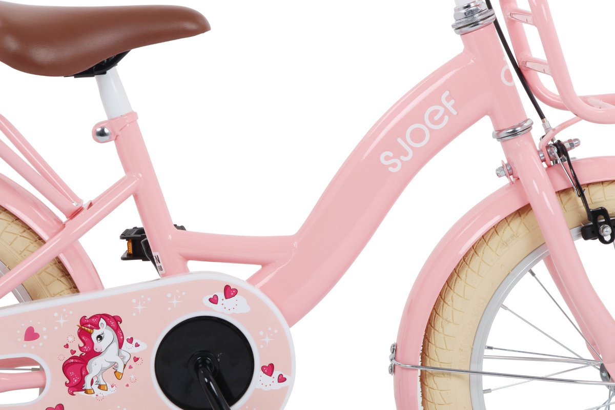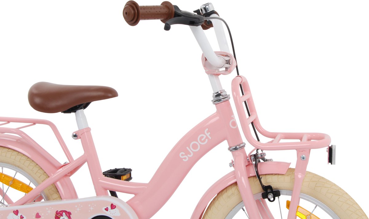 Deze fiets is bedoeld voor ouders die een degelijke, onderhoudsvriendelijke en vrolijke kinderfiets zoeken waarmee hun kind veilig leert fietsen. De SJOEF meisjesfiets 16 inch wordt voor 95% afgemonteerd geleverd en is, volgens de aanbieder, in ongeveer 5 minuten rijklaar te maken door enkel het stuur, de trappers en de zijwieltjes te monteren. Het unicorndesign en de bijpassende details op de kettingkast zorgen voor extra motivatie en fietsplezier.