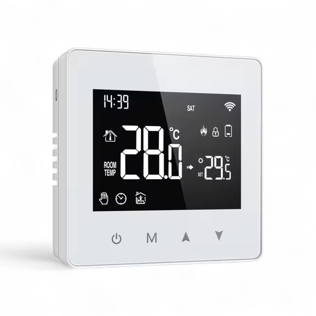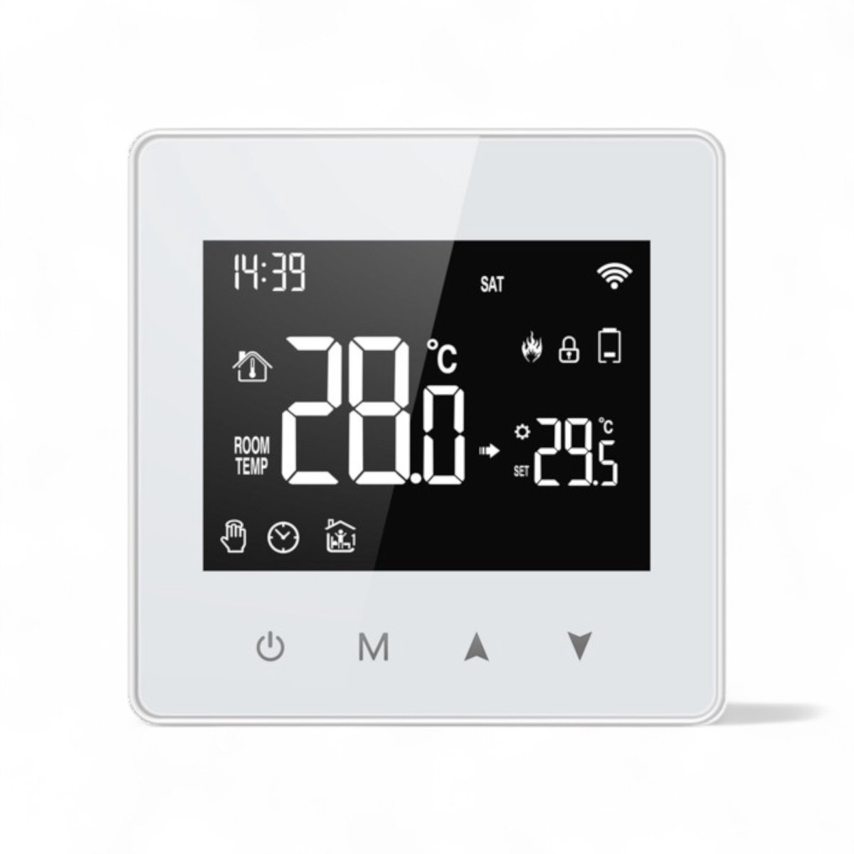 Het ontwerp is minimalistisch en strak, uitgevoerd in wit, zodat de thermostaat niet domineert op de muur. Met 86 × 86 × 25 mm blijft de unit compact. Dat helpt als je een bestaande thermostaat wilt vervangen zonder een grote afdruk achter te laten. Het gewicht (circa 170 g) is laag, wat monteren op gips of dunne muurplaten eenvoudiger maakt.