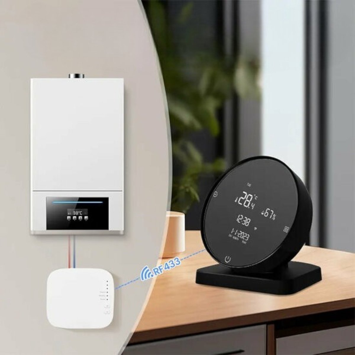 Dit is een ronde, zwarte slimme thermostaat met aanraakscherm die je cv‑verwarming draadloos laat aansturen. Hij werkt met een RF‑ontvanger bij de ketel, heeft zowel batterij- als USB‑C‑voeding en laat zich bedienen via app en spraak. De instap is laag: je hoeft geen kabels te trekken en je kunt hem opbouwen aan de muur of los neerzetten op een plank of bureau.