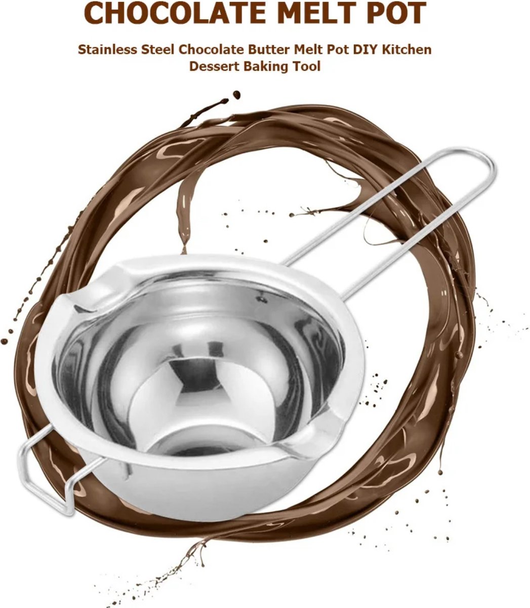 Gericht ontwerp voor au bain-marie; duidelijk geschikt voor smelten van chocolade en wax (bron: producttitel). | Belangrijke specificaties zoals materiaal, capaciteit en gewicht ontbreken in de listing (Not specified). |