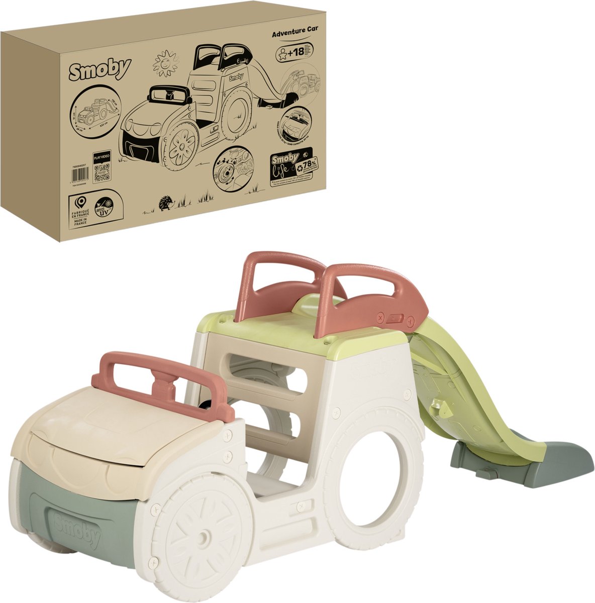 De Smoby Life Adventure Car is een buitenspeeltoestel in de vorm van een speelauto met glijbaan, ontworpen voor jonge kinderen die vanaf de eerste stapjes nieuwsgierig zijn naar “autorijden” en avontuurlijk spelen. Het combineert rollenspel (sturen, sleutel, claxon) met fysieke activiteit (klimmen, glijden) en extra speelmogelijkheden zoals een zandbak onder de motorkap en de optie om water aan te sluiten voor verfrissend speelplezier. (bron: listing, gecontroleerd 2025)