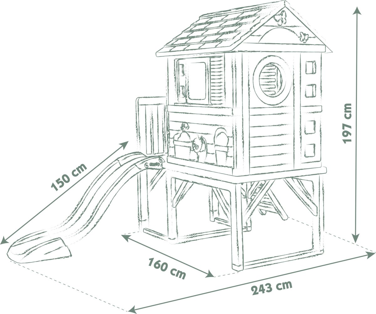De combinatie van ladder omhoog en glijbaan omlaag ondersteunt zowel klimmen (kracht en coördinatie) als gecontroleerd afdalen. Voor jonge kinderen zorgt de glijbaan voor snelle beloning na het klimmen, wat spelmotief versterkt. Praktisch: plaats het speelhuis op een vlakke, zachte ondergrond (gras of speelmat) en controleer periodiek bevestigingen van trap en glijbaan.