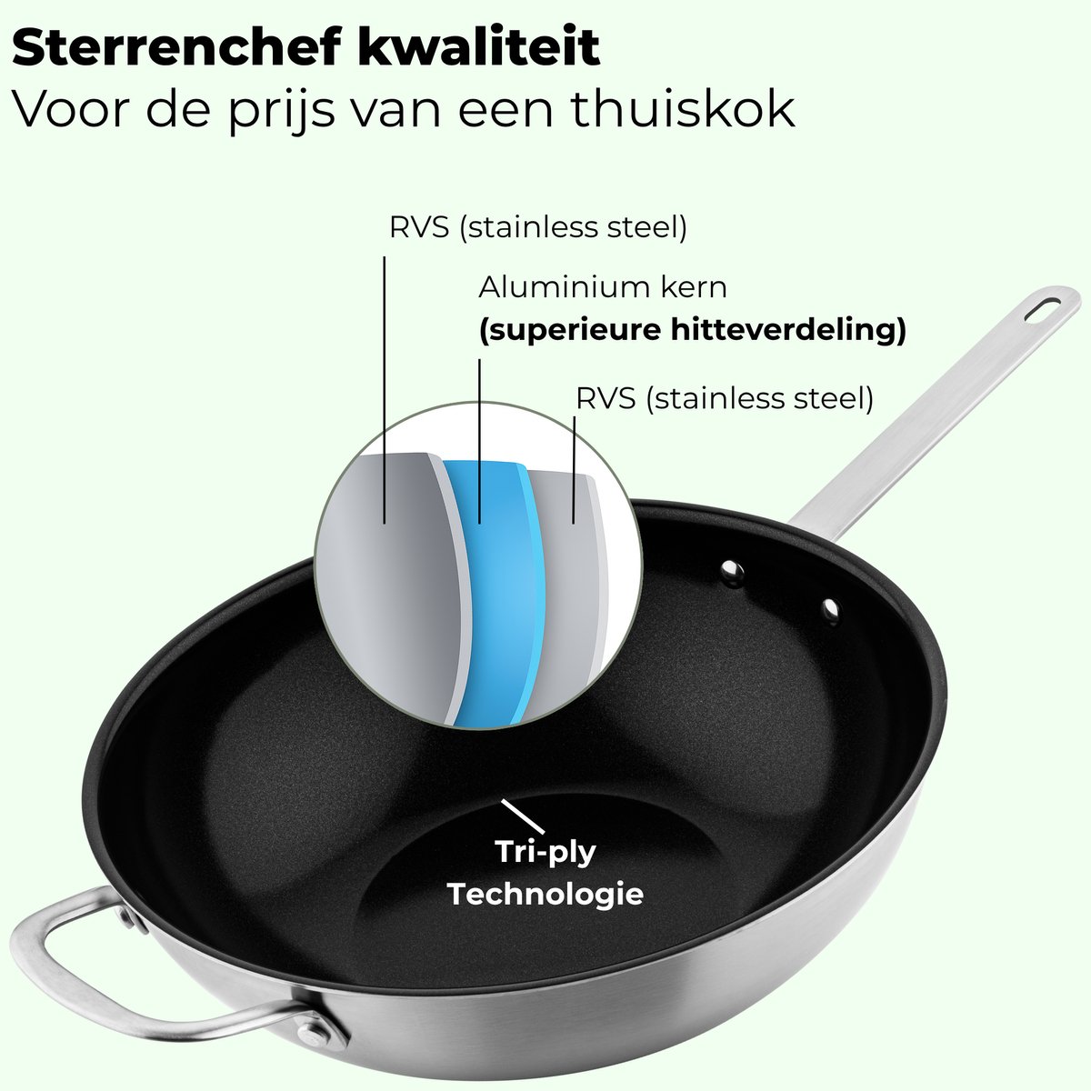 - Materiaal opbouw: drie lagen hoogwaardig RVS (Tri-Ply technologie)