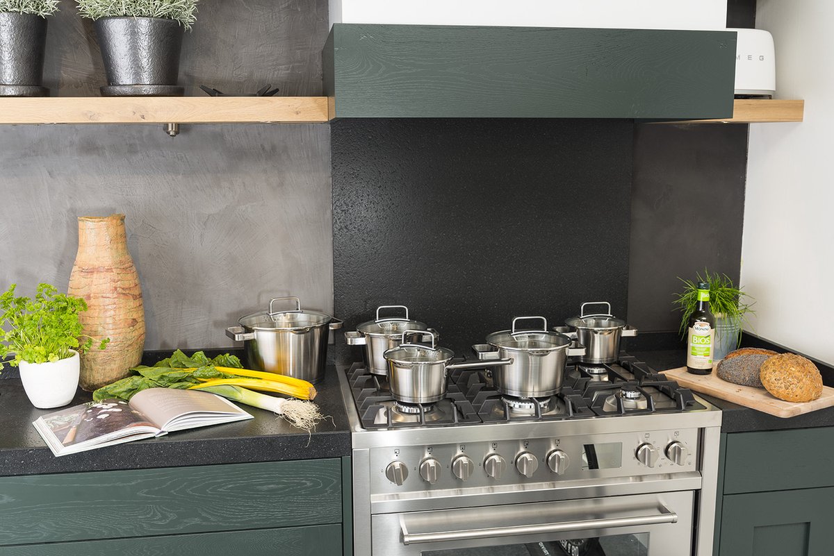 Mooie pannen, erg handig in gebruik. De glazen deksels zijn praktisch bij het afgieten — geen vergiet meer nodig — en de stoom wordt aan één kant afgevoerd, ideaal voor een downdraft-kookplaat.
