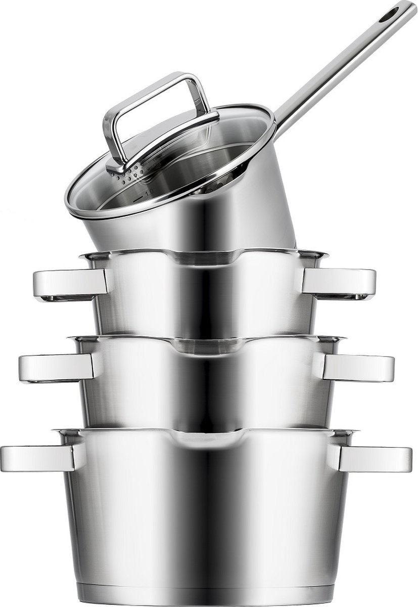 De Sola pannenset is een roestvrijstalen kookset ontworpen voor dagelijks gebruik in moderne keukens. Het materiaal (18/10 roestvrij staal) en de gepolijste afwerking geven de set een zakelijke, duurzame uitstraling en beloven bestand te zijn tegen verkleuring en roest. De pannen hebben glazen deksels met een integraal afgietmechanisme en ingebouwde maataanduiding voor extra gebruiksgemak.