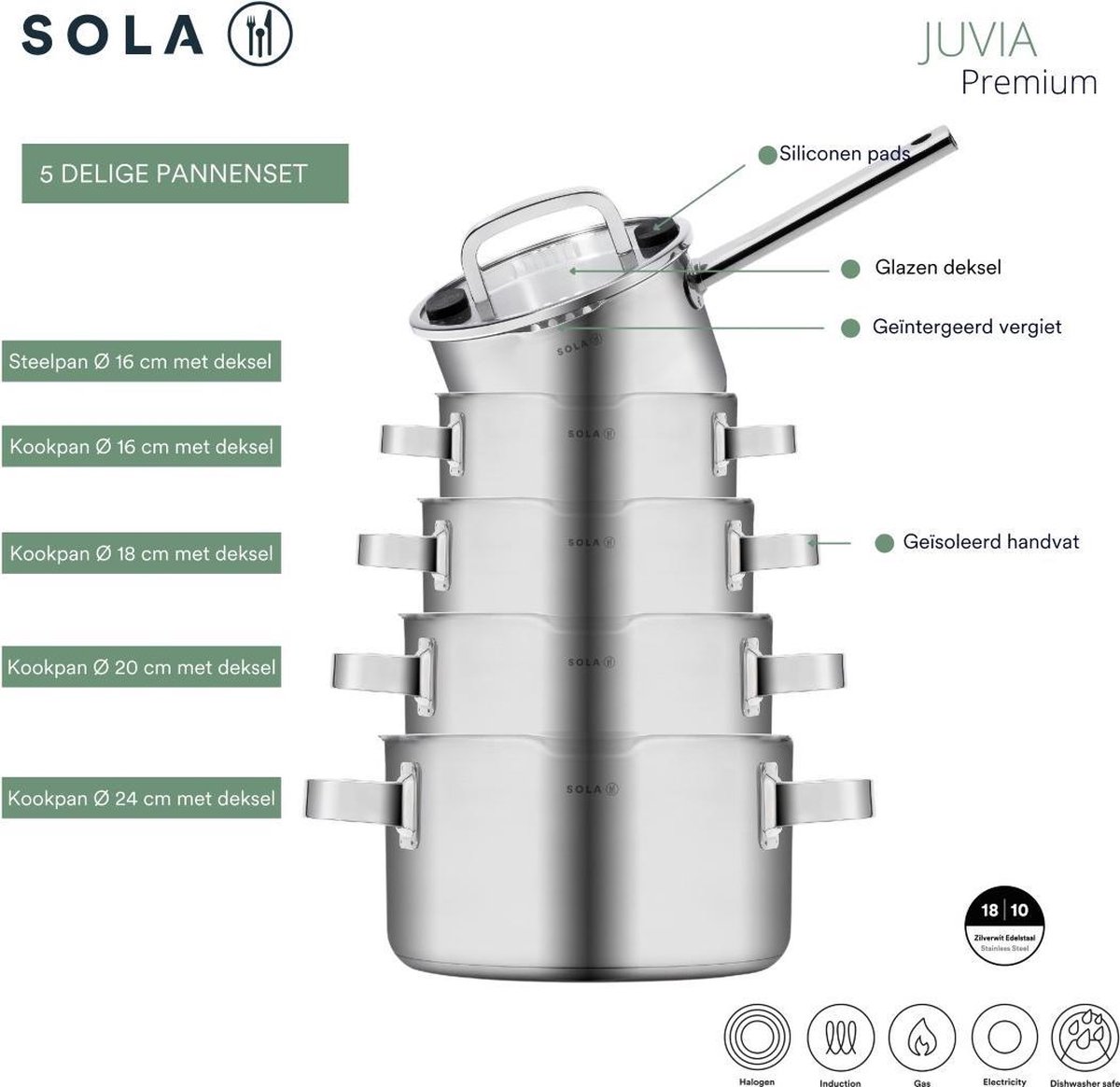 Als je op zoek bent naar een roestvrijstalen set met een nette afwerking, geschikt voor alle warmtebronnen en met lange garantie, is de Sola pannenset een goede optie. Als je precieze maten of een anti-aanbaklaag nodig hebt, zoek dan verder of vraag de verkoper om aanvullende specificaties.