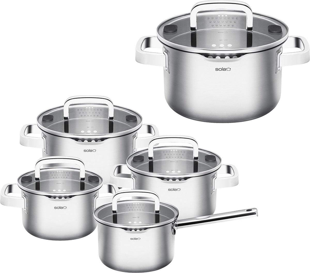 De Sola pannenset is een klassieke roestvrijstalen pannenset uit het hogere segment van Sola, ontworpen voor dagelijks gebruik in gastvrije en veeleisende keukens. De set combineert 18/10 roestvrij staal met glazen deksels, een geïntegreerd afgietmechanisme en een ingebouwde maataanduiding — eigenschappen die praktisch koken sneller en overzichtelijker maken.