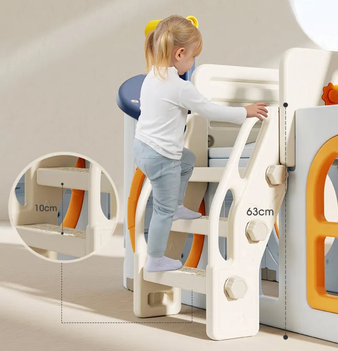 Een platformhoogte van 56 cm beperkt de valafstand en maakt zelfstandig klimmen en afdalen haalbaar voor jonge kinderen (bron: listing, checked 2025). Dit is praktisch voor ouders die willen beginnen met glijden en klimmen zonder constante fysieke ondersteuning. Het lage platform helpt ook bij het oefenen van motoriek en zelfstandig spel.