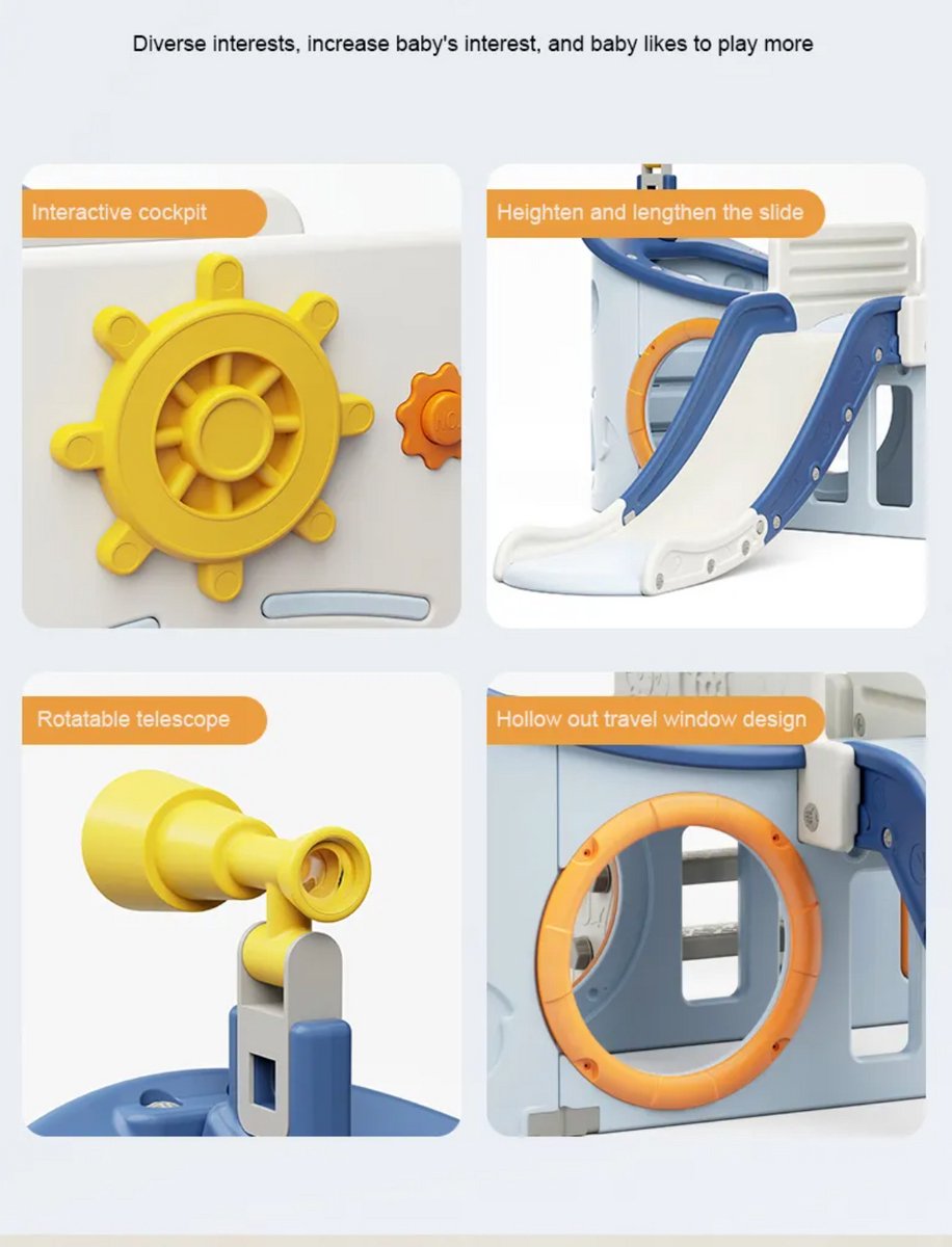Het Speeltoestel Boot Multicolor is een kunststof speelboot met glijbaan, speciaal ontworpen voor jonge kinderen. Met vrolijke kleuren, een draaibare verrekijker en een roer biedt het toestel rollenspel en bewegingsplezier voor peuters en kleuters.