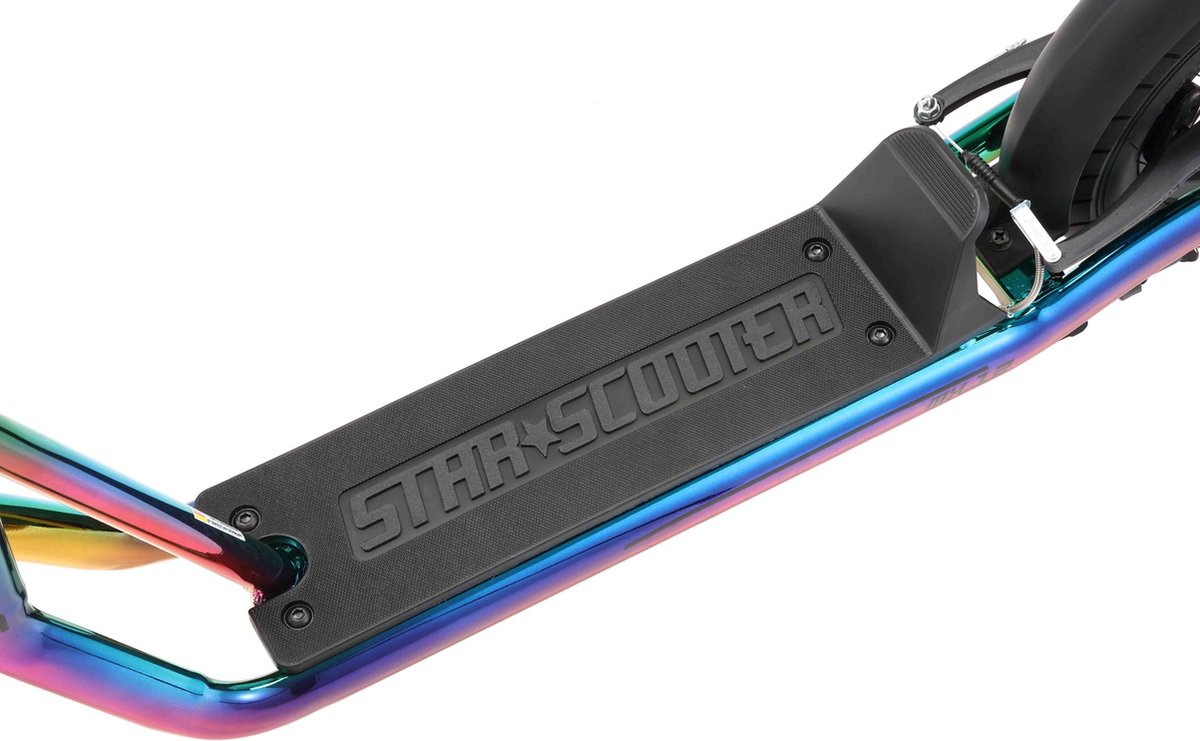 De Star Scooter is opgebouwd uit een stabiel stalen buisframe dat meerdere slagvaste laklagen heeft. Dit maakt de step robuust en duurzaam tegen stoten en krassen. De lasnaden zijn glad afgewerkt, wat niet alleen mooier oogt maar ook het risico op kleef- of snijwonden vermindert.