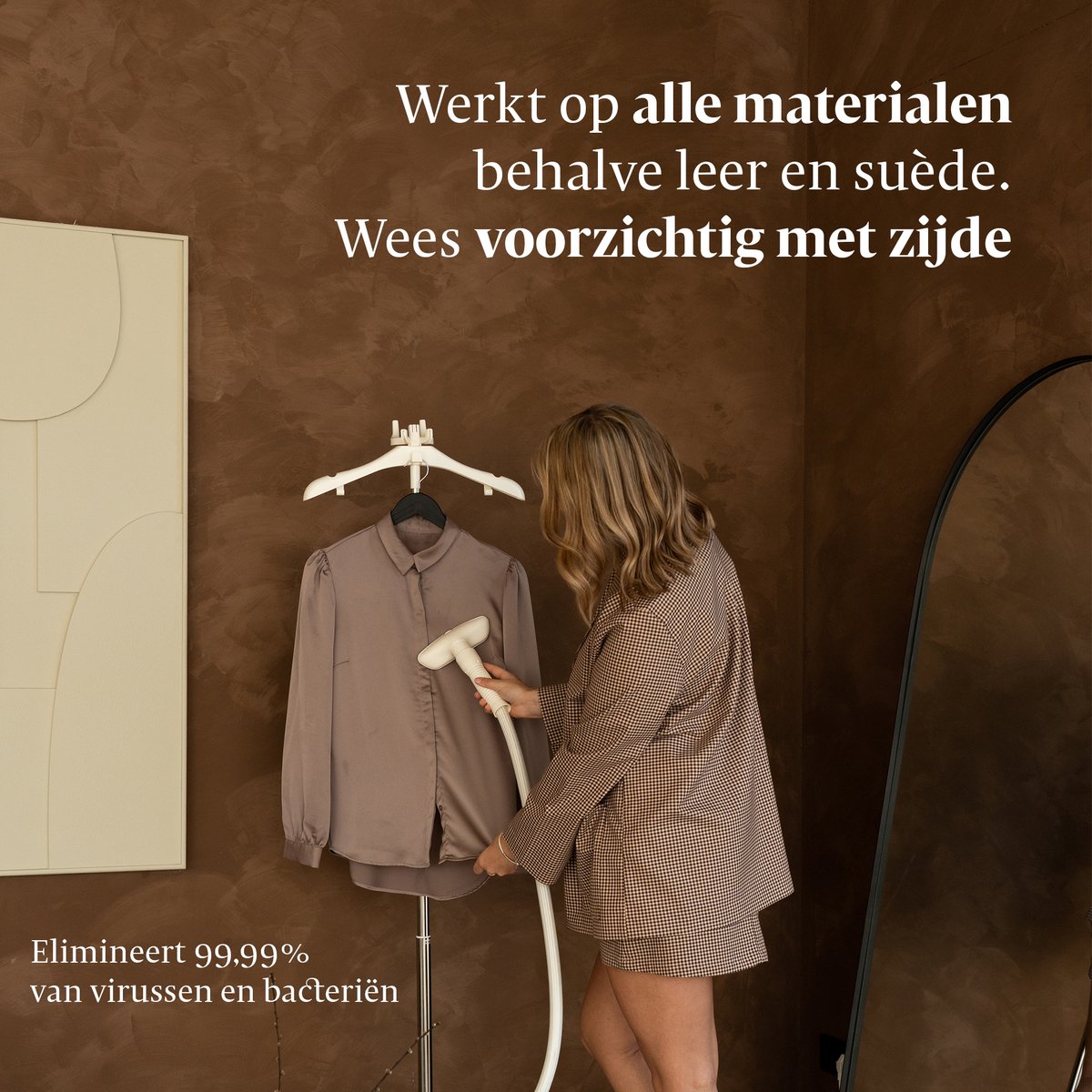 De fabrikant vermeldt dat de krachtige, constante en droge stoom 99,99% van virussen en bacteriën in de stof elimineert. Zulke claims zijn nuttig als je kleding wilt opfrissen die niet direct de was in kan, zoals jasjes, wollen truien of delicate items. Let wel: dit percentage is afkomstig van de fabrikant en geen onafhankelijke laboratoriumclaim in deze beschrijving; het blijft een nuttige eigenschap om kleding tussen wasbeurten door hygiënisch te verfrissen.