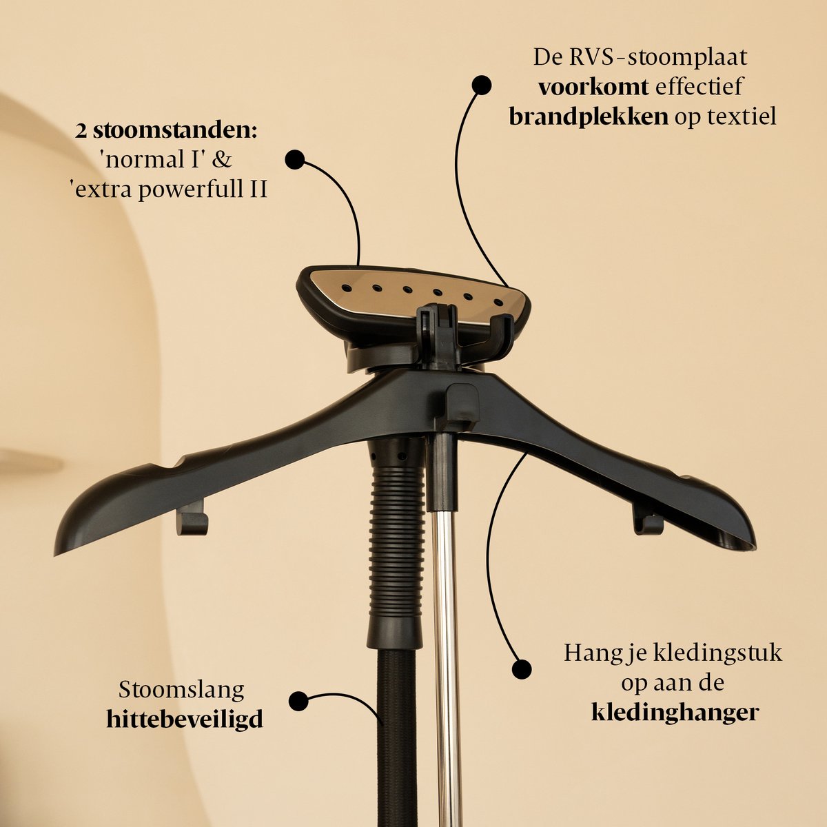 - Professionele kledingstomer (basisunit met stoomkop en stoomslang)