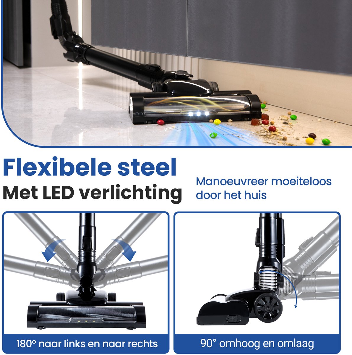 De opvallendste ontwerpkeuze is de buigbare steel. Met een knikmechanisme (90°) kun je onder lage meubels komen zonder op je knieën te hoeven. Denk aan de bank, het bed of een laag dressoir: je stuurt de vloerborstel eronder en houdt je rug recht. De turbodorstel met LED‑verlichting helpt daarbij; je ziet stofdraden en kruimels ook in donkere hoeken. Verder is het toestel zakloos, met een opvangreservoir dat je met één druk op de knop kunt legen. Een wasbaar HEPA‑filter zorgt ervoor dat fijne deeltjes beter worden vastgehouden; het exacte filtertype en het volume van het stofreservoir zijn niet vermeld.