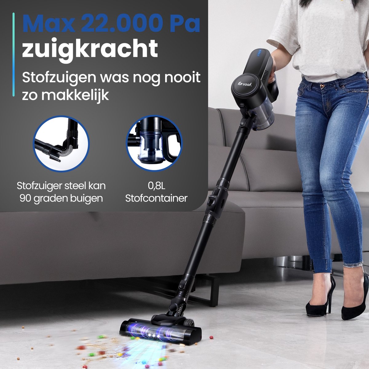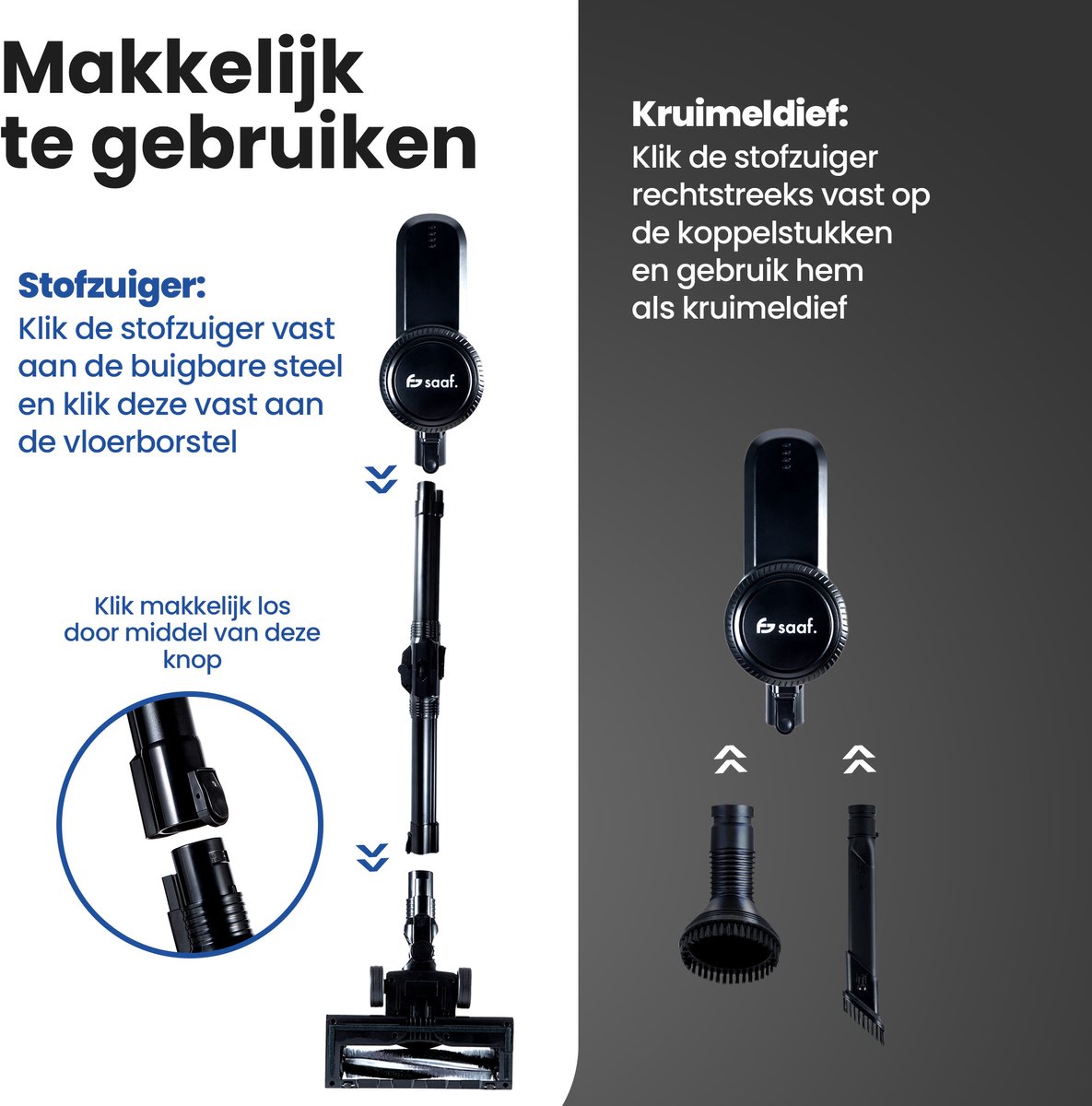 De Saaf steelstofzuiger draadloos maakt schoonmaken eenvoudig voor Nederlandse huishoudens die flexibiliteit zoeken. De buigbare steel en het lichte gewicht van 2,4 kg helpen je moeiteloos onder meubels. Met een accuduur tot 40 minuten ben je klaar voor dagelijkse rondes.