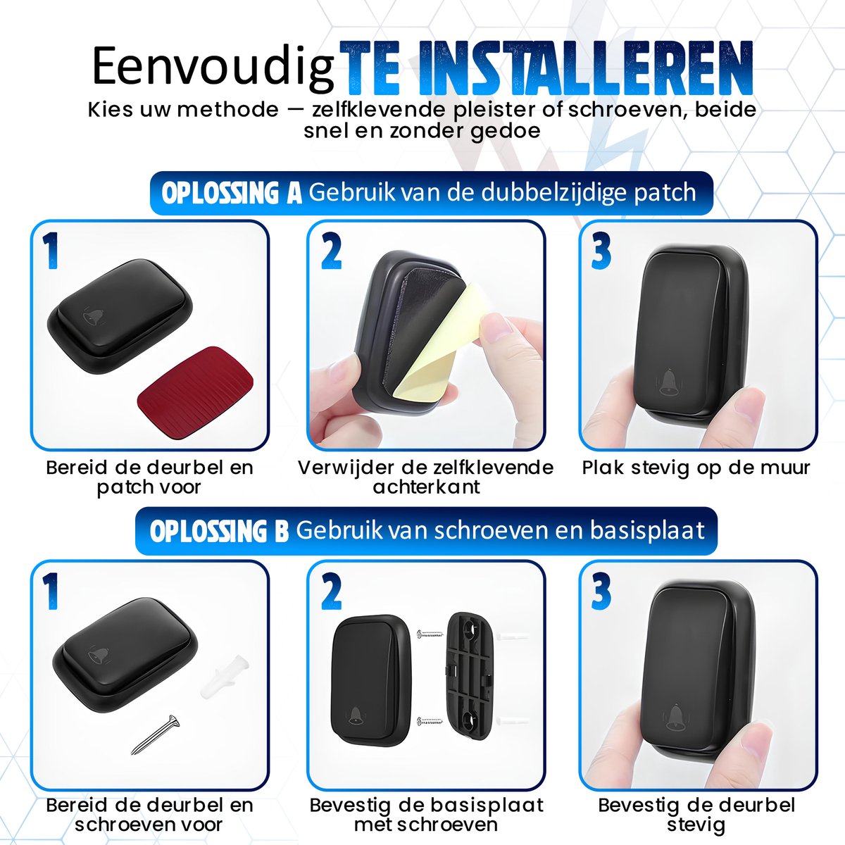 De set is ontworpen voor snelle, probleemloze installatie. De beldrukker heeft al een 12V 23A batterij meegeleverd en kan met de dubbelzijdige tape worden bevestigd of met meegeleverde schroeven en pluggen stevig worden vastgezet. De ontvangers gaan rechtstreeks in het stopcontact: inpluggen, melodie en volume kiezen, klaar.