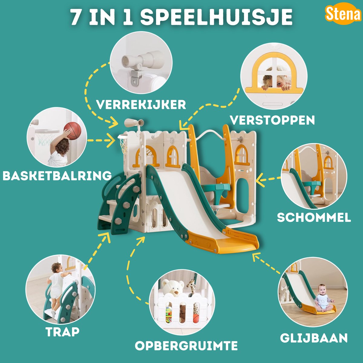 Dit 7-in-1 speelhuisje is een compact speeltoestel dat meerdere speelvormen combineert: glijden, klimmen, schommelen, basketballen, verkennen met een verrekijker en verstopspelletjes — plus opbergruimte onderin. Het toestel is ontworpen voor gebruik binnen en buiten en benadrukt veiligheid met afgeronde randen, antislip en een schommel met veiligheidsbeugel.