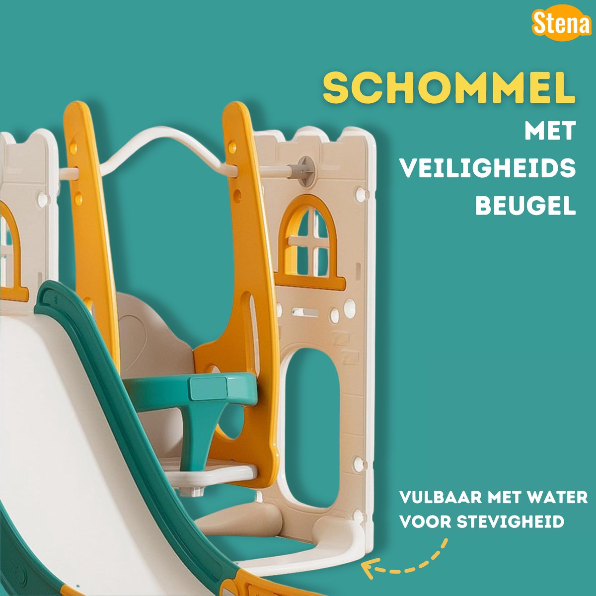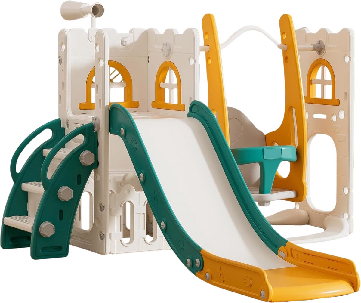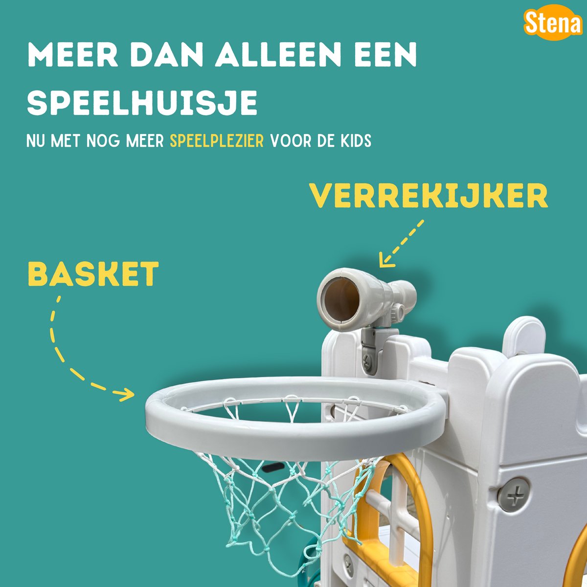 Functies | 7-in-1 (glijbaan, klimrek, opbergruimte, schommel, verrekijker, verstopmogelijkheden, basketbalring) |