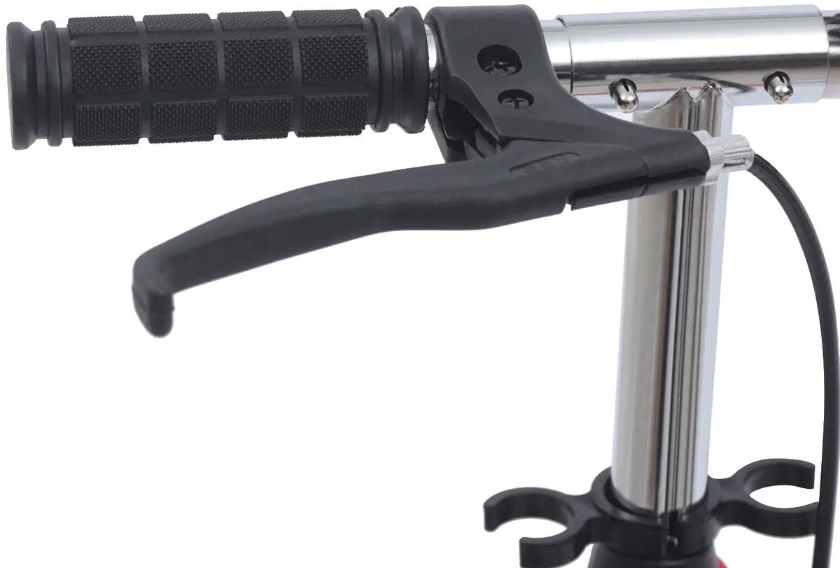 De step heeft een stevig koolstofstalen frame, verstelbaar stuur en een dubbel remsysteem voor veilige stops. Het snelle opvouwmechanisme maakt hem eenvoudig mee te nemen of op te bergen.