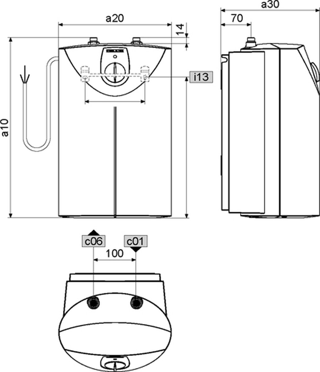 De aansluitingen zitten aan de bovenzijde. Dat is handig bij plaatsing in een keukenkastje onder het aanrecht: de aan- en afvoerleidingen lopen dan kort en overzichtelijk omhoog naar de kraan. De vermelding “plaatsing onder de kraan” geeft aan dat dit een zogenaamde puntbron is: het is geen centrale boiler voor het hele huis, maar een apparaat dat warm water levert dicht bij één gebruikspunt, waarmee onnodige wachttijd en warmteverlies in lange leidingen wordt voorkomen (zoals door de aanbieder geclaimd).