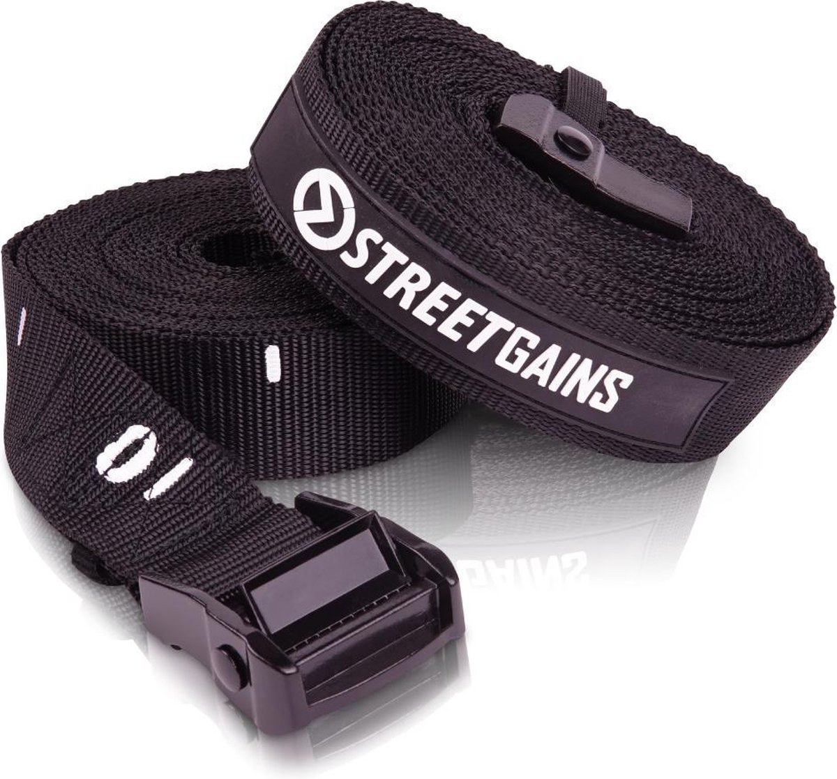 De set bevat twee extra lange nylon riemen van 5,50 meter. Deze lengte geeft veel flexibiliteit bij het ophangen, bijvoorbeeld aan hoge balken of bomen. De riemen zijn afgewerkt met lengteaanduidingen zodat je beide ringen exact op dezelfde hoogte kunt hangen — belangrijk voor symmetrie tijdens pull-ups, dips en muscle-ups. Er is ook een opgerolde klittenbandsluiting die overtollig materiaal netjes vastzet, zodat je er niet aan blijft hangen tijdens dynamische bewegingen.