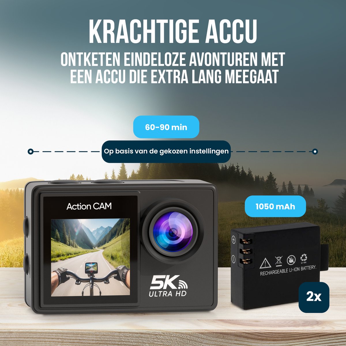 Wat het betekent: de camera wordt geleverd met twee accu’s van 1050mAh. Exacte opnameduur per batterij is niet vermeld in de listing.