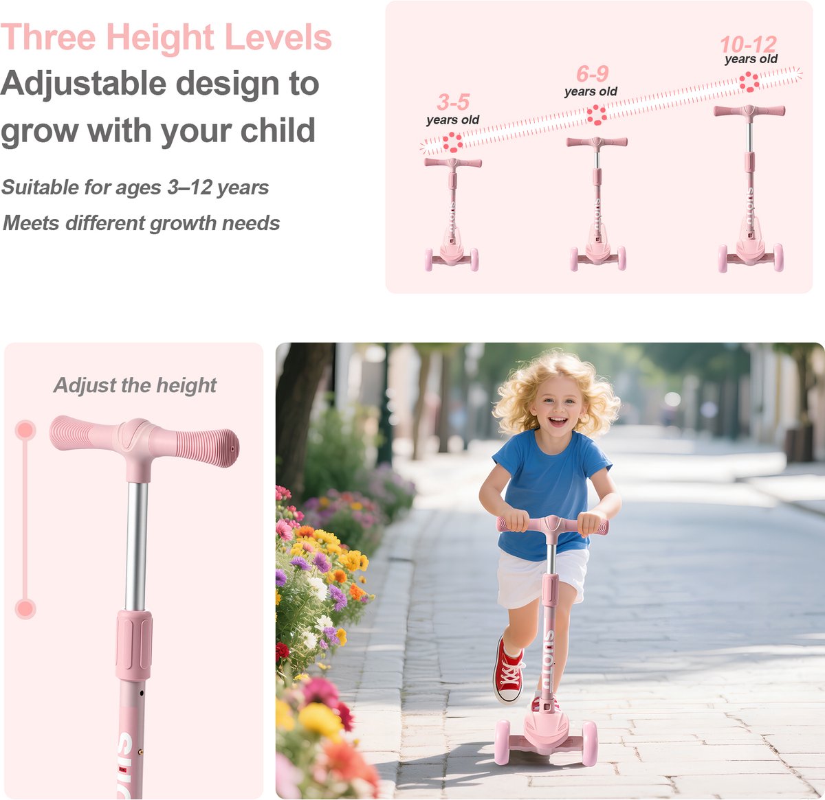 De roestvrije T-stang is in drie standen verstelbaar van 64 cm tot 80 cm (source: listing, checked 2025). Dat maakt de step geschikt voor verschillende lengtes en zorgt ervoor dat de houding van het kind ergonomisch blijft naarmate het groeit. Ouders hoeven dus minder snel een nieuwe step te kopen.