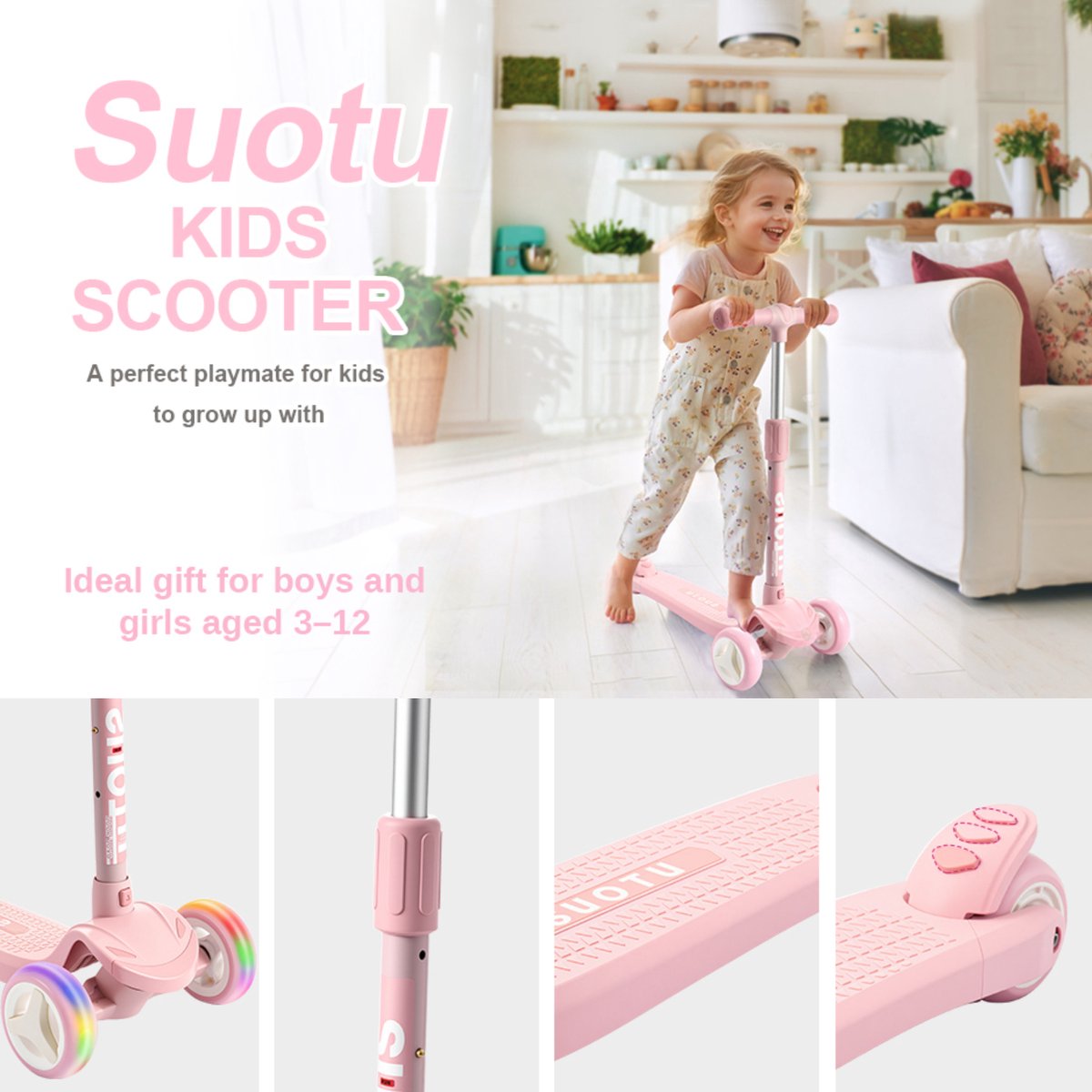De Suotu Scooter is een driewielige kinderstep met extra brede, lichtgevende wielen en een verstelbare stuurhoogte. Hij is bedoeld voor jonge kinderen die hun balans en coördinatie willen oefenen, met extra aandacht voor stabiliteit en zichtbaarheid tijdens het spelen.