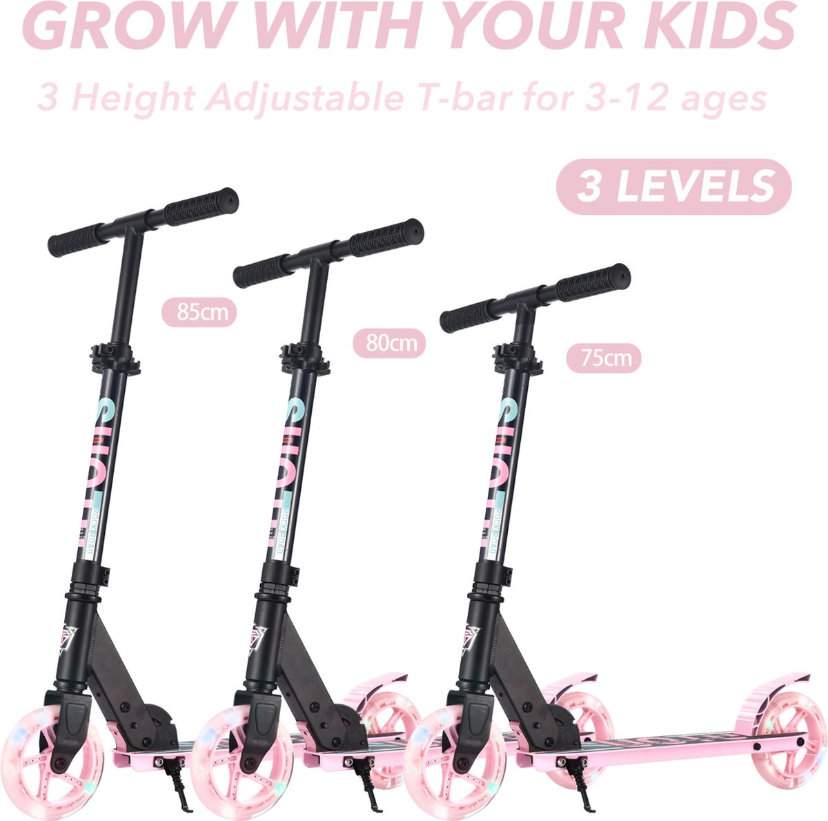 Het stuur heeft drie hoogteposities: 71 cm, 78 cm en 86 cm, waardoor de step meegroeit met kinderen van verschillende lengtes en makkelijk tussen broertjes/zusjes gedeeld kan worden. Dit is vooral handig als meerdere kinderen van verschillende leeftijden de step gebruiken of als je wilt dat de step langer meegaat in de groeiperiode van je kind.
