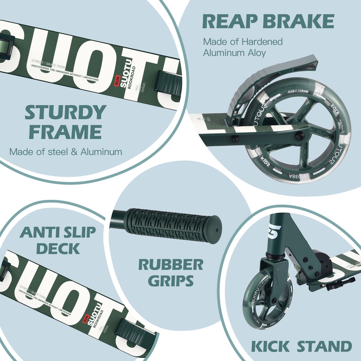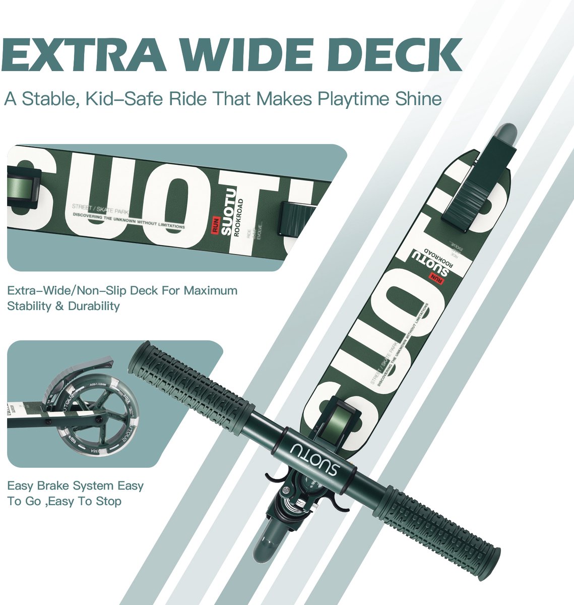 De Suotu kinderscooter is opgebouwd uit een aluminium dek, een stalen T-buis en een aluminium T-bar. Het dek is volgens de fabrikant dikker en breder gemaakt dan bij veel goedkopere modellen, wat de duurzaamheid zou verhogen. De wielen zijn 145 mm en bestaan uit PVC+PU; in het hart daarvan zit een magnetische kern die de LED-verlichting aandrijft via beweging (source: listing, checked 2025).