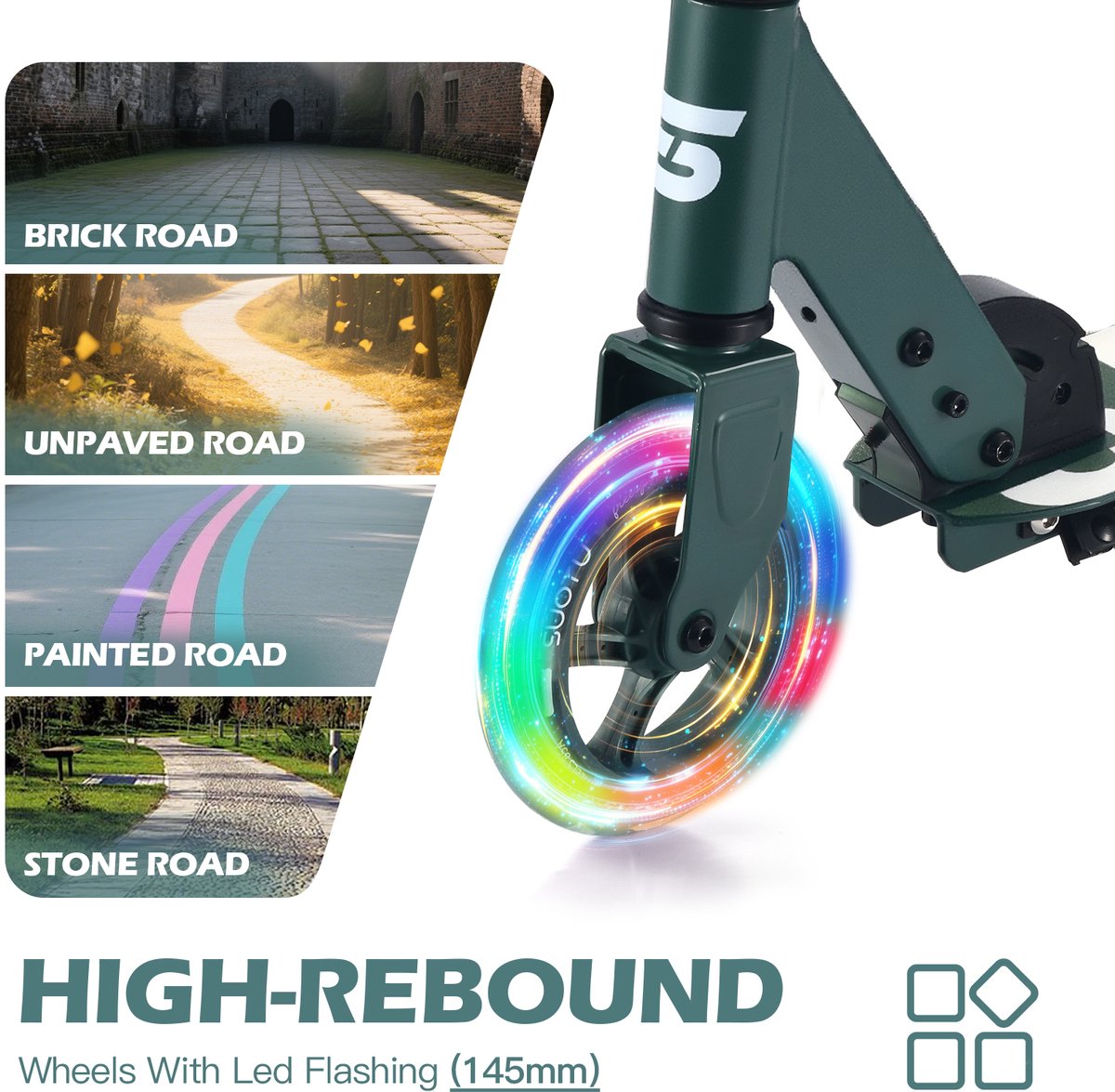 De Suotu kinderscooter is een opvouwbare kinderstep met twee led-verlichte wielen, ontworpen voor jonge rijders van ongeveer 3 tot 9 jaar. Hij combineert een lichtgewicht aluminium constructie met een verstevigd dek, een achterspatbord-voetrem en verstelbaar stuur, zodat hij met je kind meegroeit.