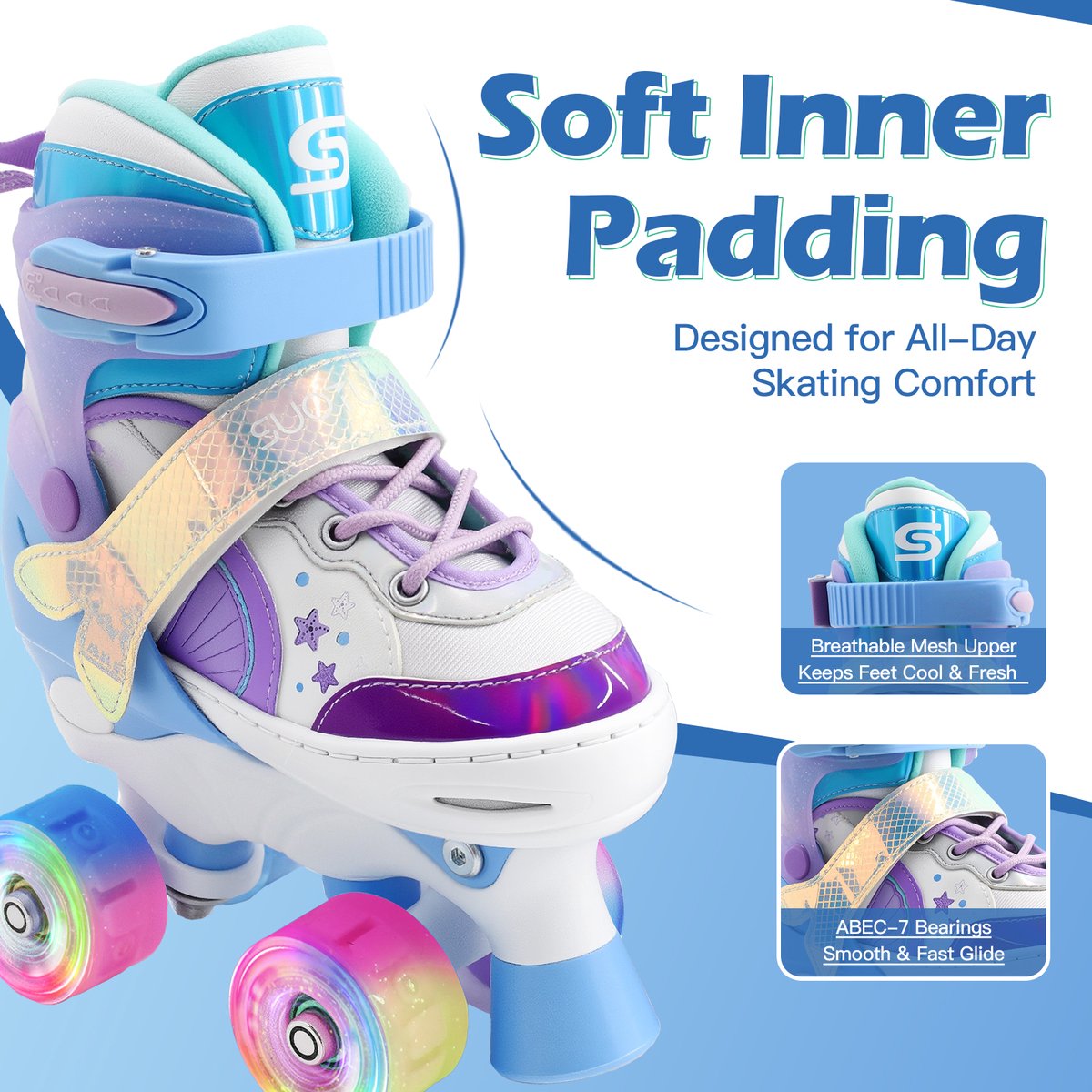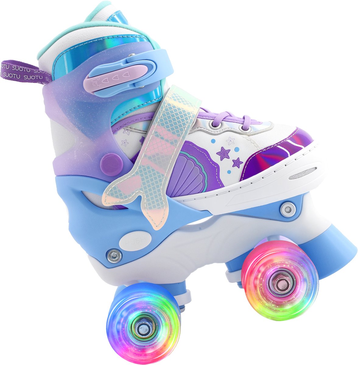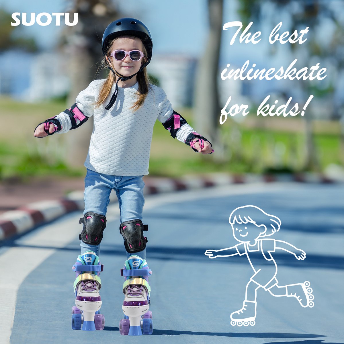 Deze SUOTU inline skates zijn lichtgewicht, verplaatsbare skates ontworpen voor kinderen die net leren skeeleren of al wat meer zelfvertrouwen op wielen krijgen. De schaatsen bieden verstelbaarheid over vier maten, lichtgevende wielen zonder batterijen en een stevig één-stuks frame dat stabiliteit moet bieden voor jonge rijders.