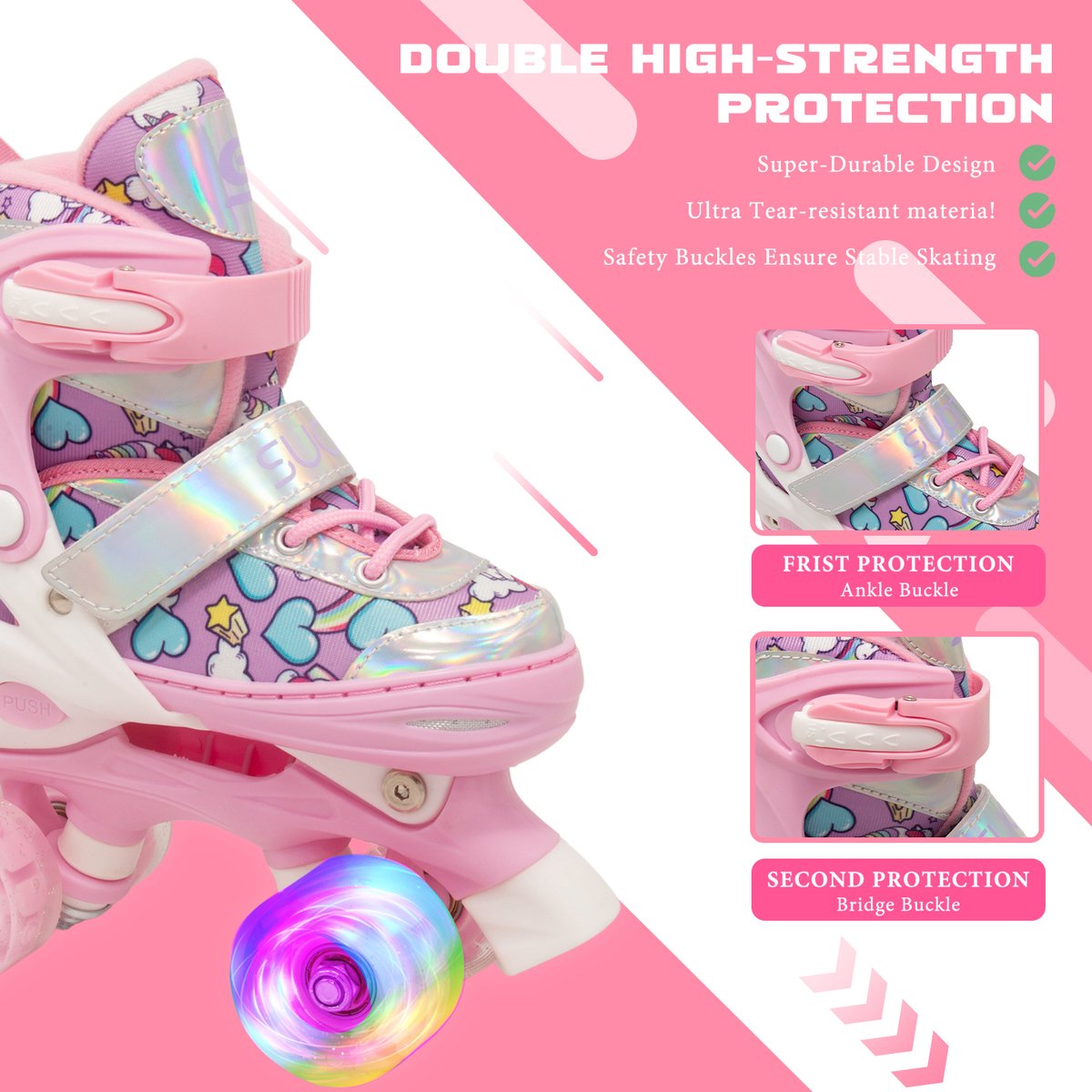 Deze SUOTU verstelbare inline skates zijn rolschaatsen voor kinderen die meegroeien met kleine voeten en die extra zichtbaarheid willen tijdens het spelen. Het model heeft een verstelbare schoen in vier maten, twee sluitgespen voor een stevige pasvorm en wielen die oplichten zonder batterijen, aangedreven door beweging.