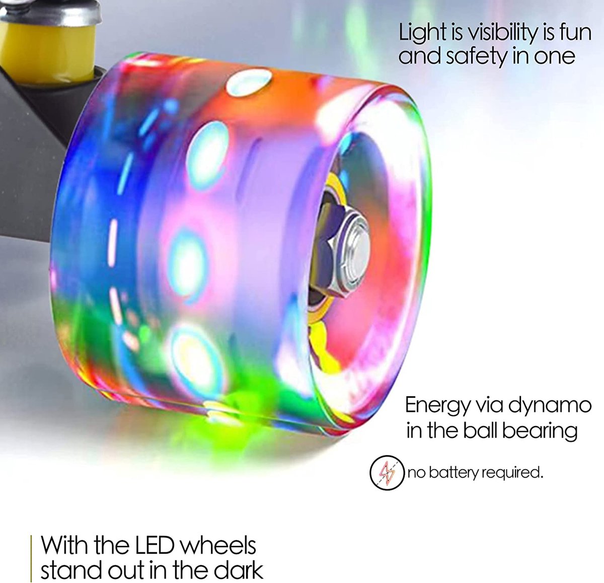 De wielen zijn zachte PU-wielen van 60 mm, wat bijdraagt aan schokabsorptie en een comfortabele rit op gladde oppervlakken. De combinatie van PU-wielen en ABEC-7 lagers zorgt voor een vlotte, snelle rolervaring zonder dat er extra aandrijving of batterijen nodig zijn: de LED-effecten in de wielen zijn rotatiegedreven (geen batterijen) (source: listing, checked 2025).