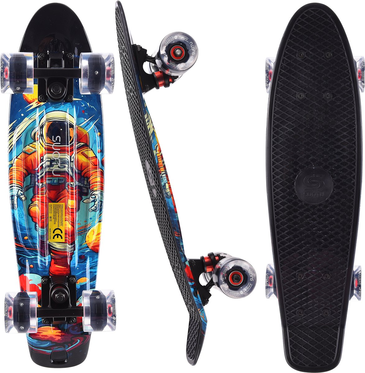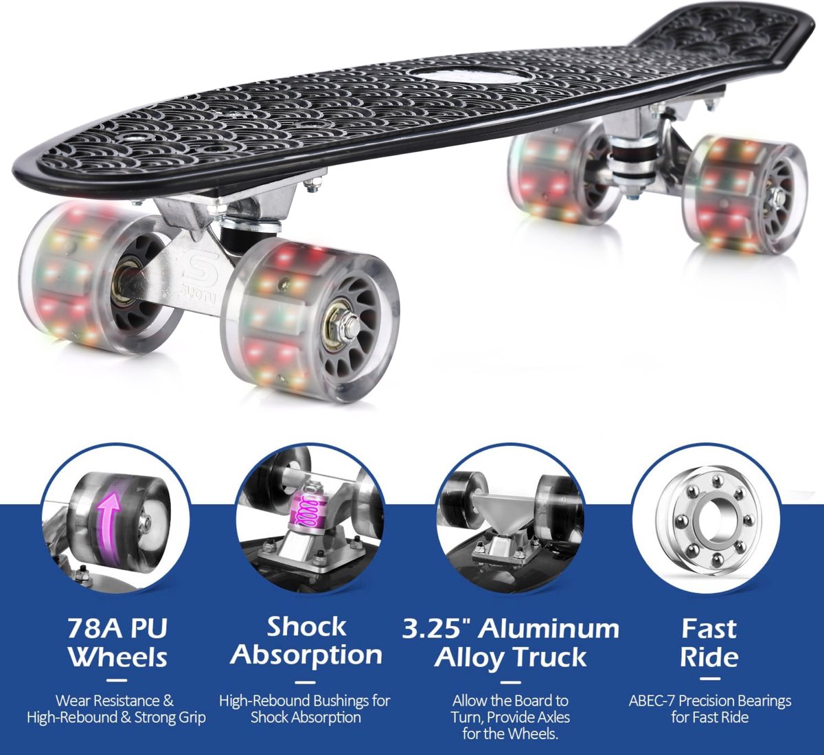 De Suotu 22 Inch Plastic Cruiser is een compact, volledig gemonteerd mini-skateboard met draaiende LED-wielen en ABEC-7 lagers, bedoeld voor kinderen, tieners en lichte volwassenen die willen oefenen met balans of gewoon plezierig willen cruisen. Het bord combineert een kleurrijk ontwerp met onderdelen die volgens de fabrikant getest zijn op veiligheid en duurzaamheid.