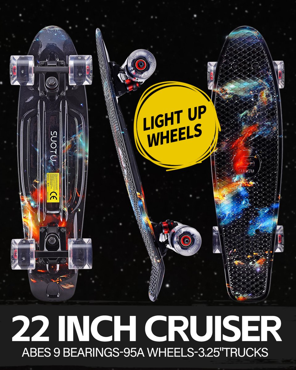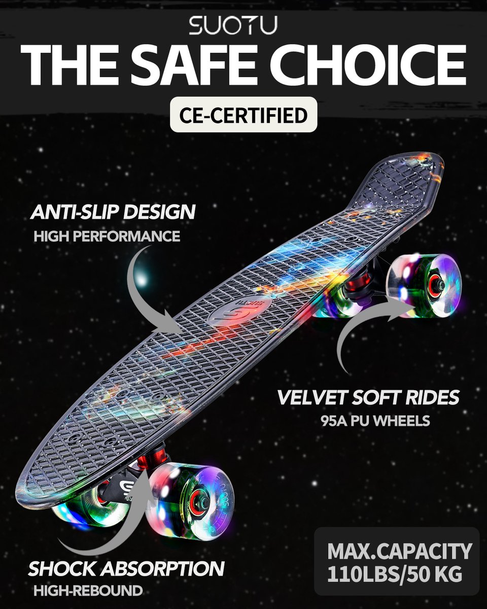 Overzicht:Het Suotu skateboard is een compacte cruiser met opvallende LED-wielen, perfect voor Nederlandse kinderen en beginnende skaters die veiligheid en plezier zoeken. Het deck is 22 inch en het board ondersteunt een maximale belasting van 50 kg.