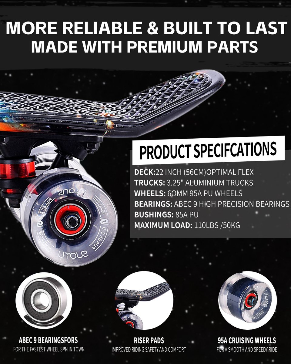 60 mm PU-wielen en soepele lagers zorgen voor comfortabele rit | Klein formaat (22 x 6 inch) minder geschikt voor grotere voeten of ervaren rijders |