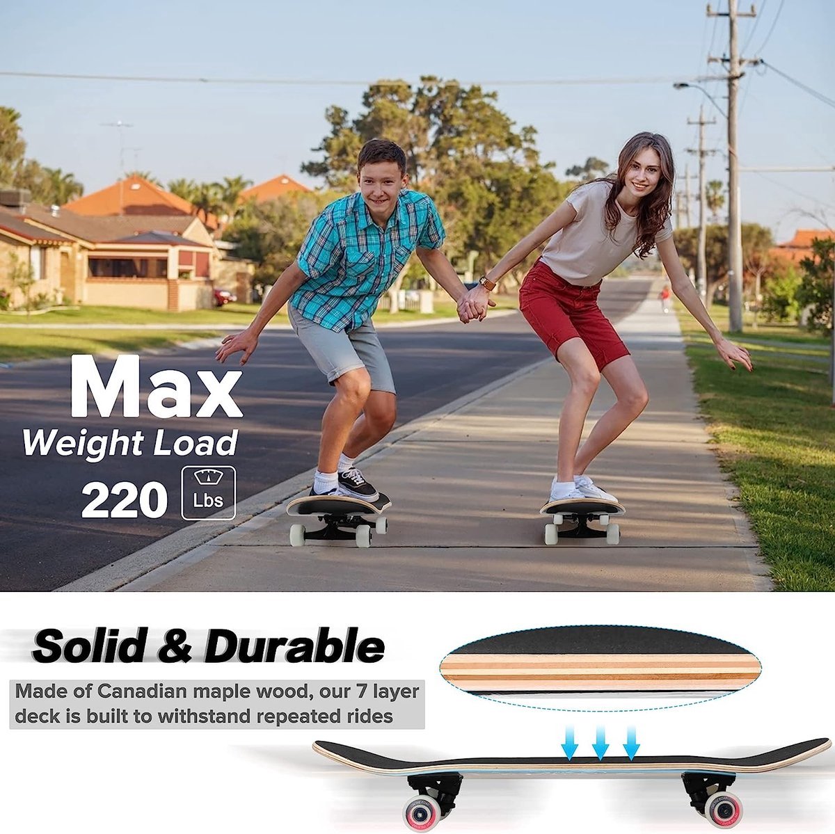 7-laags Canadees esdoorn deck voor goede sterkte en duurzaamheid | Niet gespecificeerd of riser pads standaard worden meegeleverd |