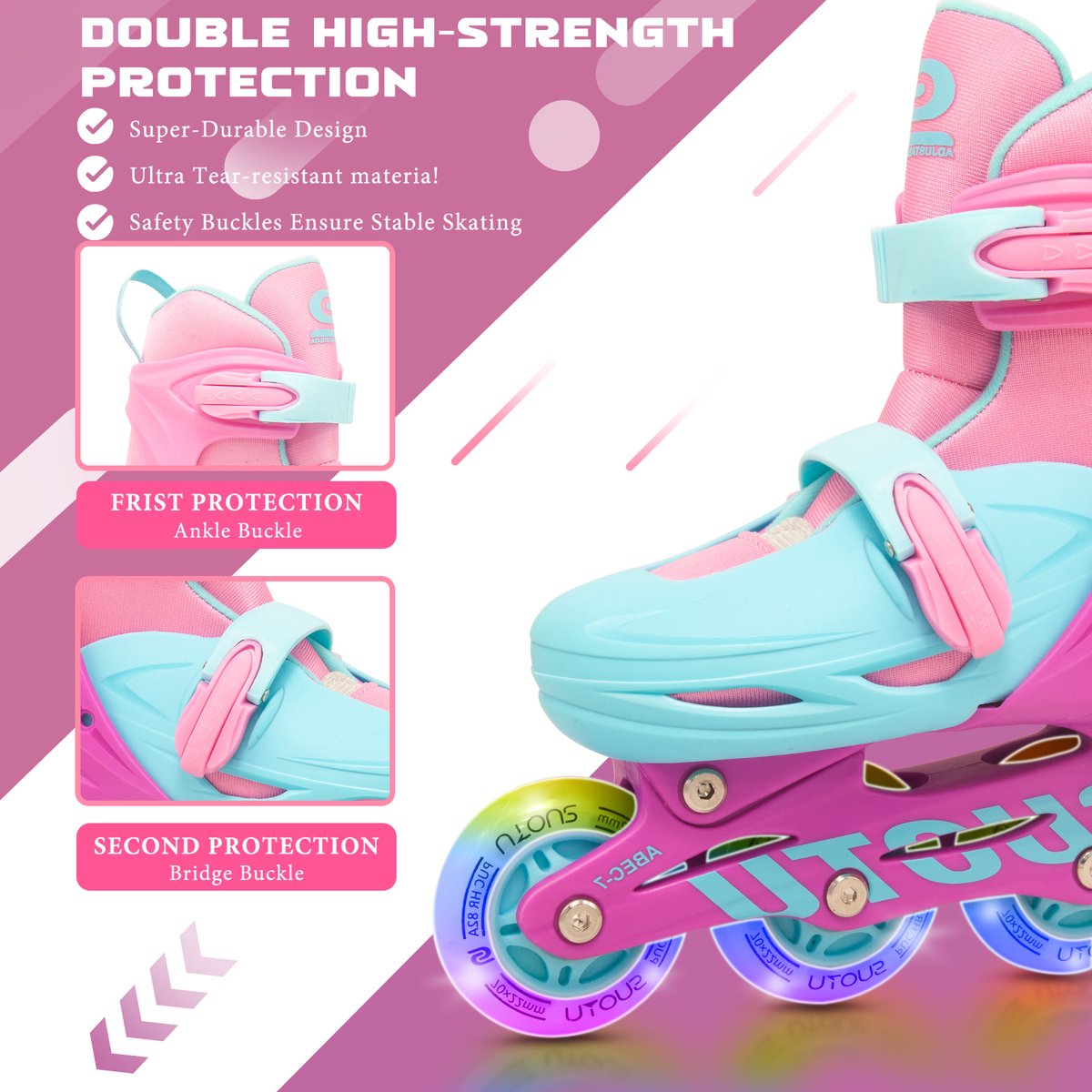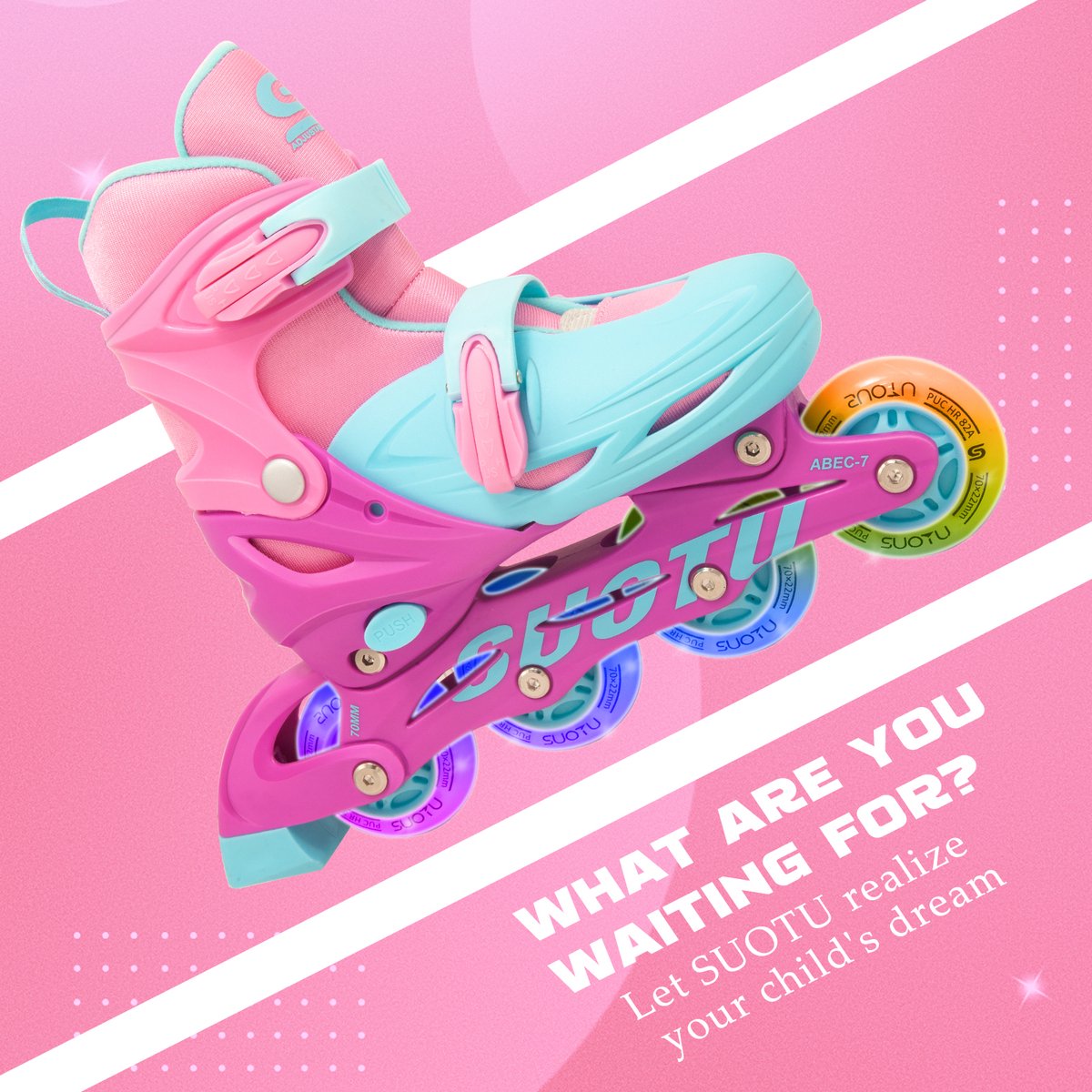 Deze SUOTU inline skates zijn verstelbare kinderschaatsen met zelfgenererende verlichting in de wielen. Ze richten zich op opgroeiende kinderen die willen leren schaatsen of recreatief willen rijden, zonder telkens een nieuw paar te hoeven kopen. Het ontwerp combineert een lichtgewicht, geïntegreerd frame met eenvoudige maatinstelling en twee gespen voor een stevige pasvorm.