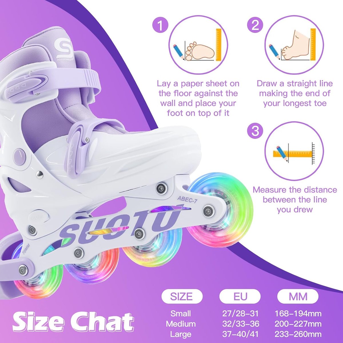 De SUOTU Inline Skates voor kinderen zijn verstelbare rolschaatsen met lichtgevende wielen en een eenvoudig aanpassysteem. Ze zijn ontworpen voor opgroeiende kinderen: één paar kan in vier maten versteld worden en heeft twee gespen voor een stevige, modieuze pasvorm. (Kort verdict: goede keuze voor beginnende en licht gevorderde kinderen die willen oefenen en zichtbaar willen zijn.)